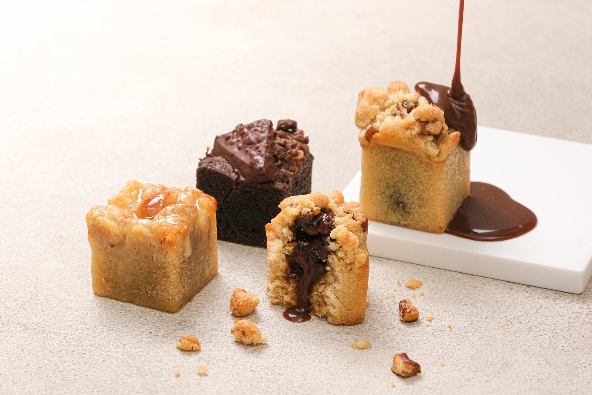 ひとくちで、チョコレートのフィナンシェ生地、クランブル、ガナッシュ、焼きチョコとさまざまなチョコレートをお楽しみいただけます。