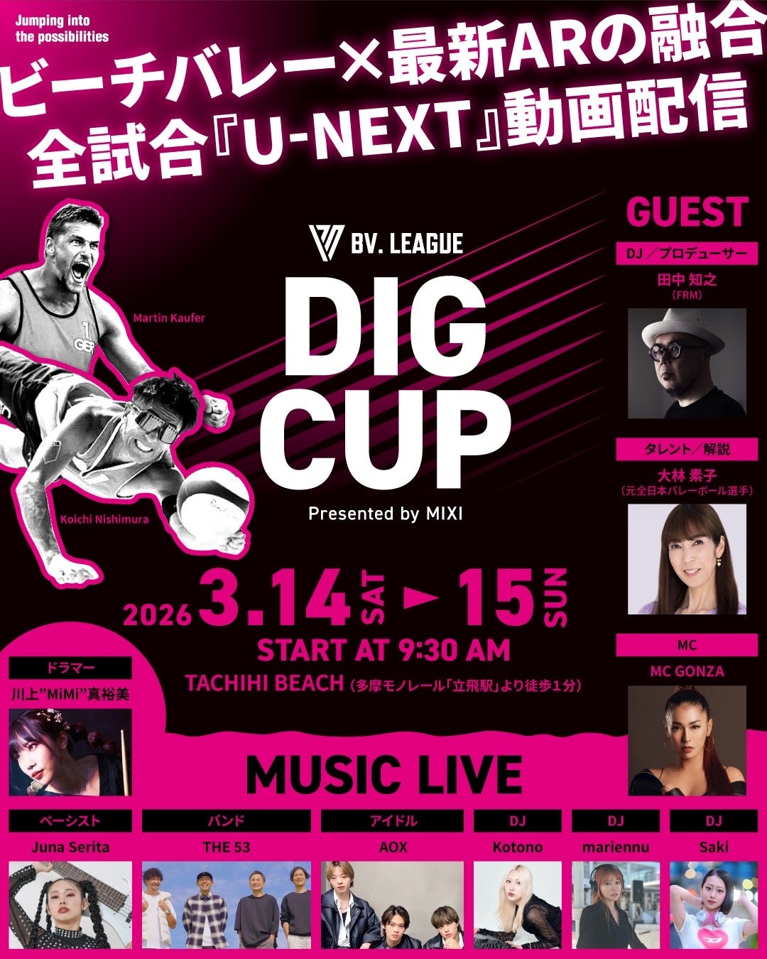 2人制公認大会(プロ選手参加)と4人制一般大会(アマチュア参加)を同時開催し、競技の裾野を広げるとともに観戦者に多様な楽しみを提供します。さらに、世界初の試みとして、MIXIの最新技術を活用し、リアルとバーチャルを融合した革新的な映像演出を展開。ライブ配信やアーカイブ映像を通じて、現地観戦者だけでなくオンライン視聴者も楽しめる新しいスポーツ体験を創出します。