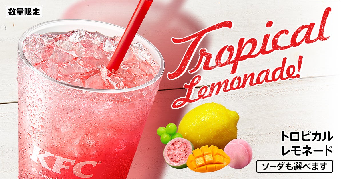 「レッドホットチキン」は、レッドペッパーとホワイトペッパーにハバネロを加えたキレのある辛さと、国内産チキンの旨みを味わえる辛口チキン。そんな「レッドホットチキン」に、今年は新たな楽しみ方「激辛ソース」が新登場です。唐辛子やチリパウダーで辛味をふんだんに際立たせた別売りソースを追いがけすることで1辛、3辛、5辛!? お好みの辛さでより刺激的な味を体感いただけます。辛いもの好きの方だけでなく、辛さでこの暑さを吹き飛ばしたい、なんて方もぜひ挑戦してみてください!また、昨年7月に初登場し、大変ご好評をいただいた「トロピカルレモネード」が今年も登場。KFCオリジナルのレモネードにグアバピューレ、マンゴー・ピーチ・白ブドウの果汁を合わせた、トロピカルなフレーバーのレモネードです。炭酸を加えた「トロピカルレモネードソーダ」もご用意しています。