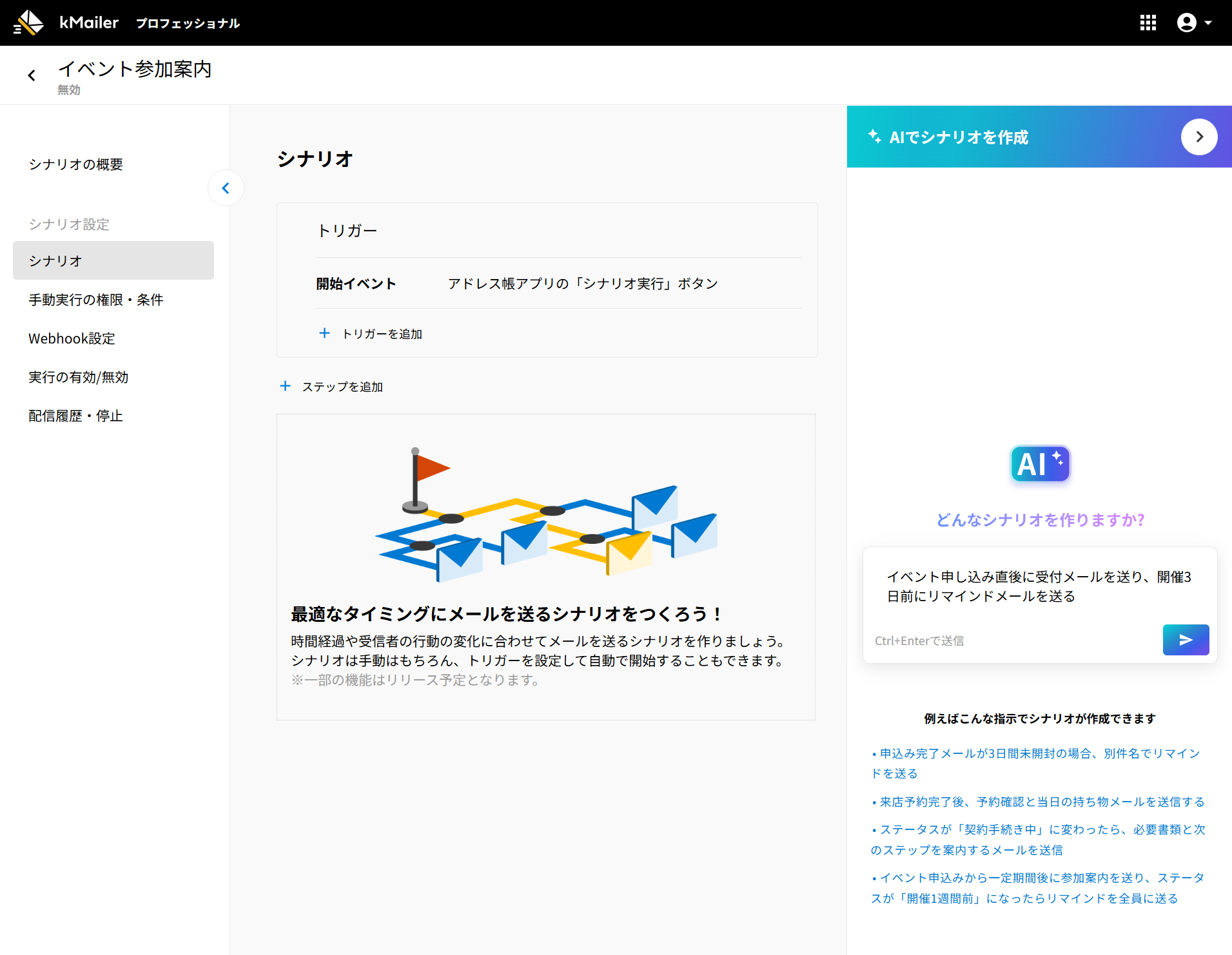 特に、複数回のメールを自動配信する「シナリオメール」の運用を開始するには、これまでユーザー自身がマニュアルを参照し、送信タイミングや条件といったステップを手作業で組み立てる工程が必要でした。そのため、運用イメージはあるものの設定手順が壁となり、活用を後回しにしてしまうケースが存在しました。