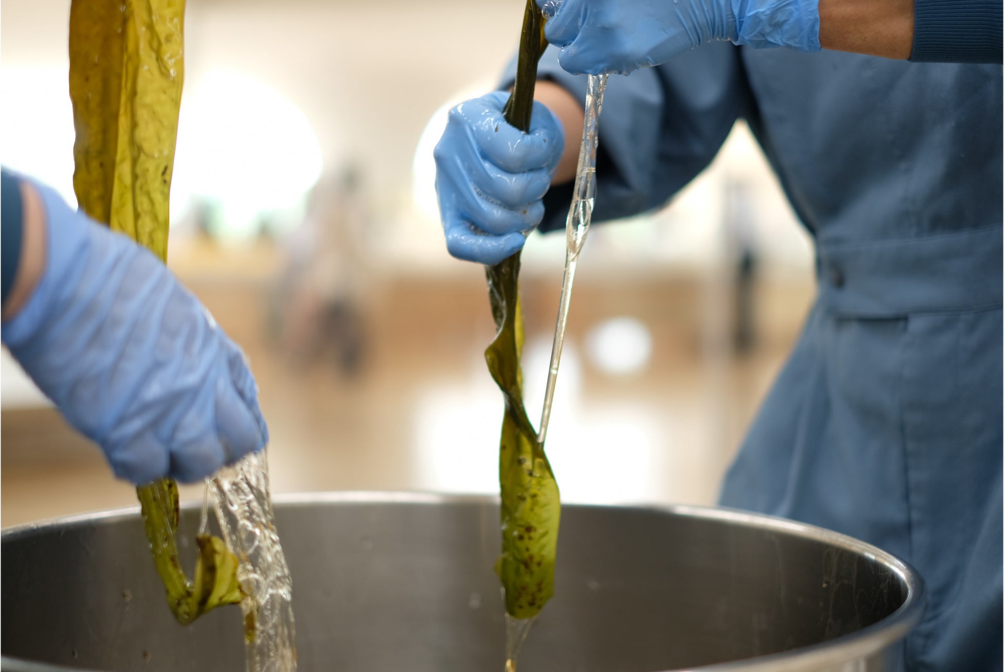 がごめ昆布の製品開発は、本来捨てられてしまう部分を使って2010年にスタート。アイテムはバスパックでした。しかし、現在の美容液をはじめとするアイテムは、食べられる最高品質の昆布からでした。そして、久しぶりに函館の漁師さんの元を訪ねると、肌につけた時に痒みの原因となる塩分や不純物を取り除くため、丁寧に水洗いされ、食用で出荷するには不要な作業をしていただいることを知ります。お客様に安全な製品をお届けするのはもちろん大切なことですが、漁師さんに労力と時間を強いることは、私たちが望む状況ではありませんでした。