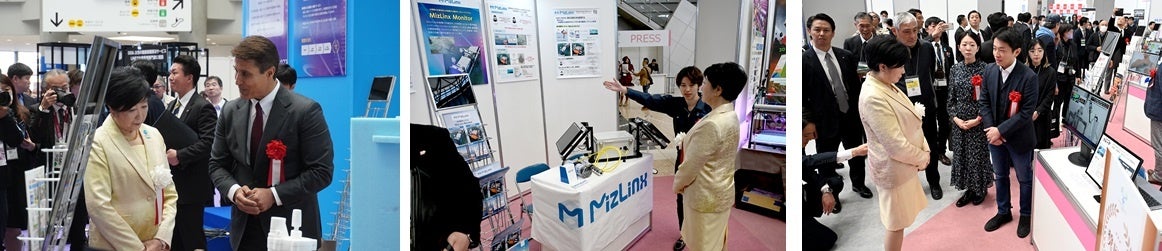 「産業交流展2023」での表彰式終了後、小池百合子東京都知事が東京都ベンチャー技術大賞のブースを視察。企業から受賞製品に関する説明を受けました。