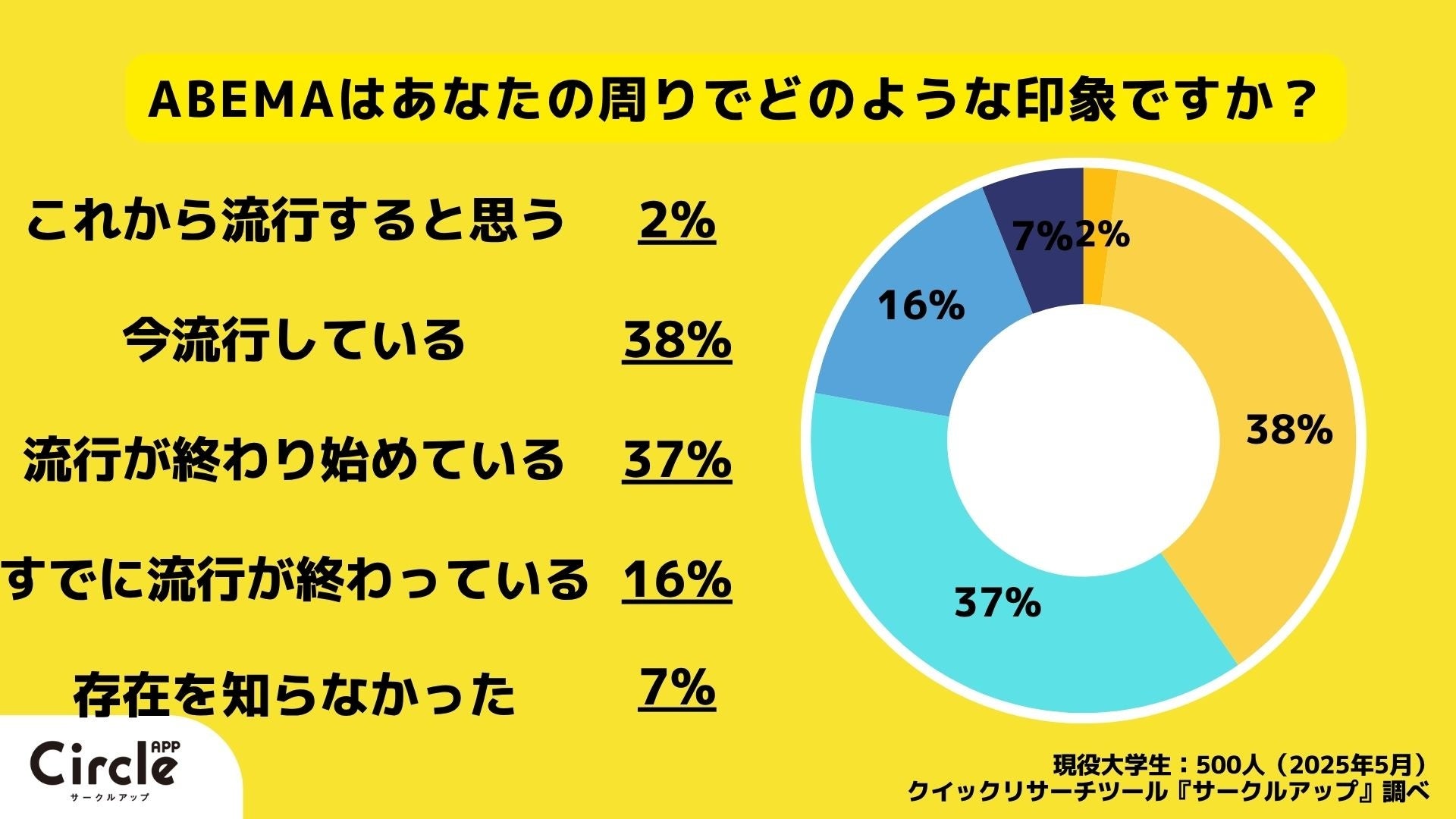 ABEMAはあなたの周りでどのような印象ですか?という質問に対し、これから流行すると思うと回答した人は2%、今流行していると回答した人は38%、流行が終わり始めていると回答した人は37%、すでに流行が終わっていると回答した人は16%、存在を知らなかったと回答した人は7%でした。
