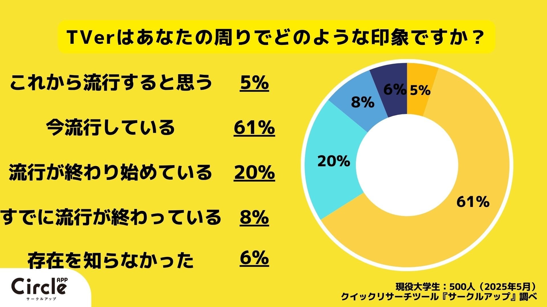 TVerはあなたの周りでどのような印象ですか?という質問に対し、これから流行すると思うと回答した人は5%、今流行していると回答した人は61%、流行が終わり始めていると回答した人は20%、すでに流行が終わっていると回答した人は8%、存在を知らなかったと回答した人は6%でした。