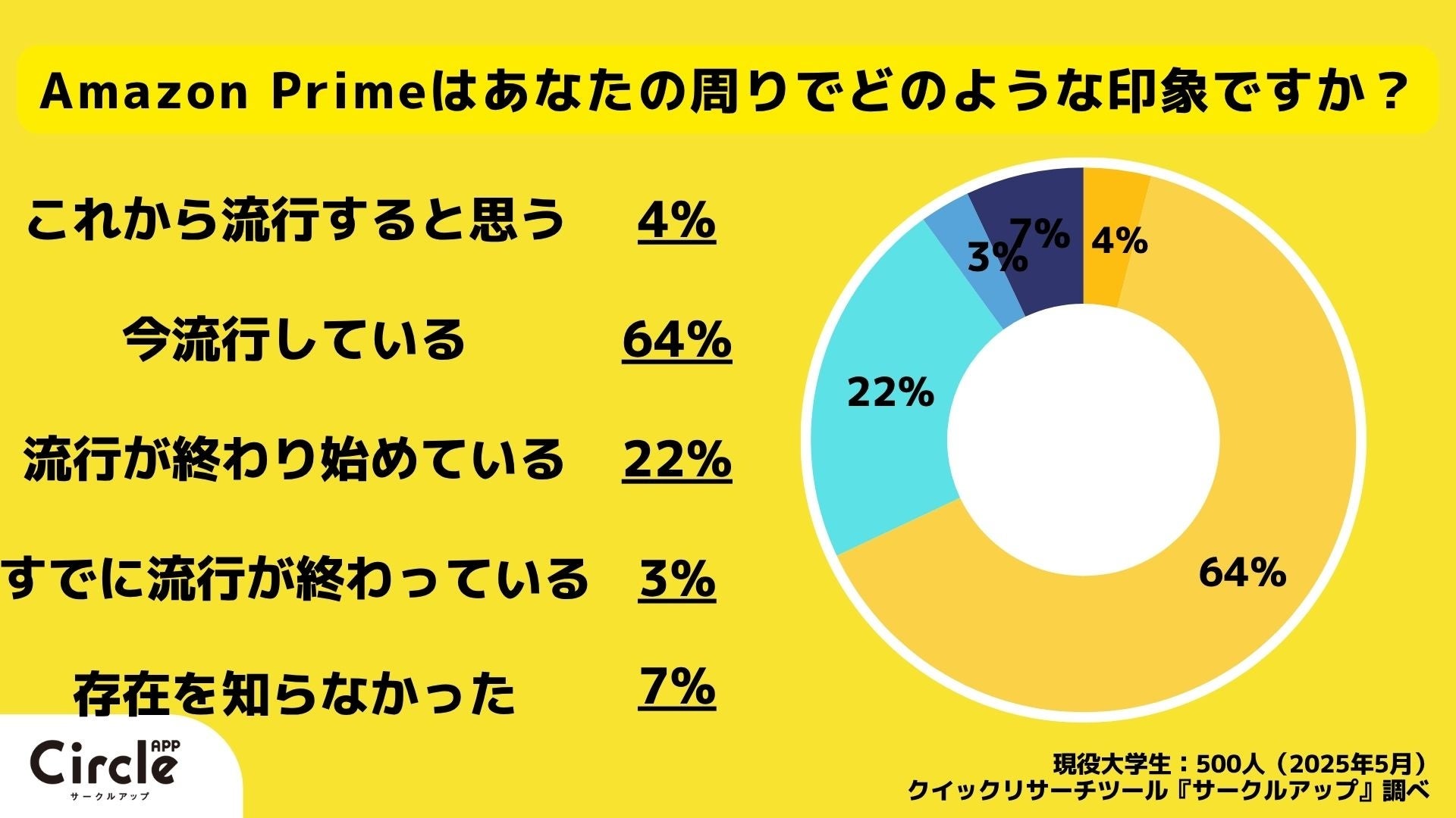 Amazon Primeはあなたの周りでどのような印象ですか?という質問に対し、これから流行すると思うと回答した人は4%、今流行していると回答した人は64%、流行が終わり始めていると回答した人は22%、すでに流行が終わっていると回答した人は3%、存在を知らなかったと回答した人は7%でした。