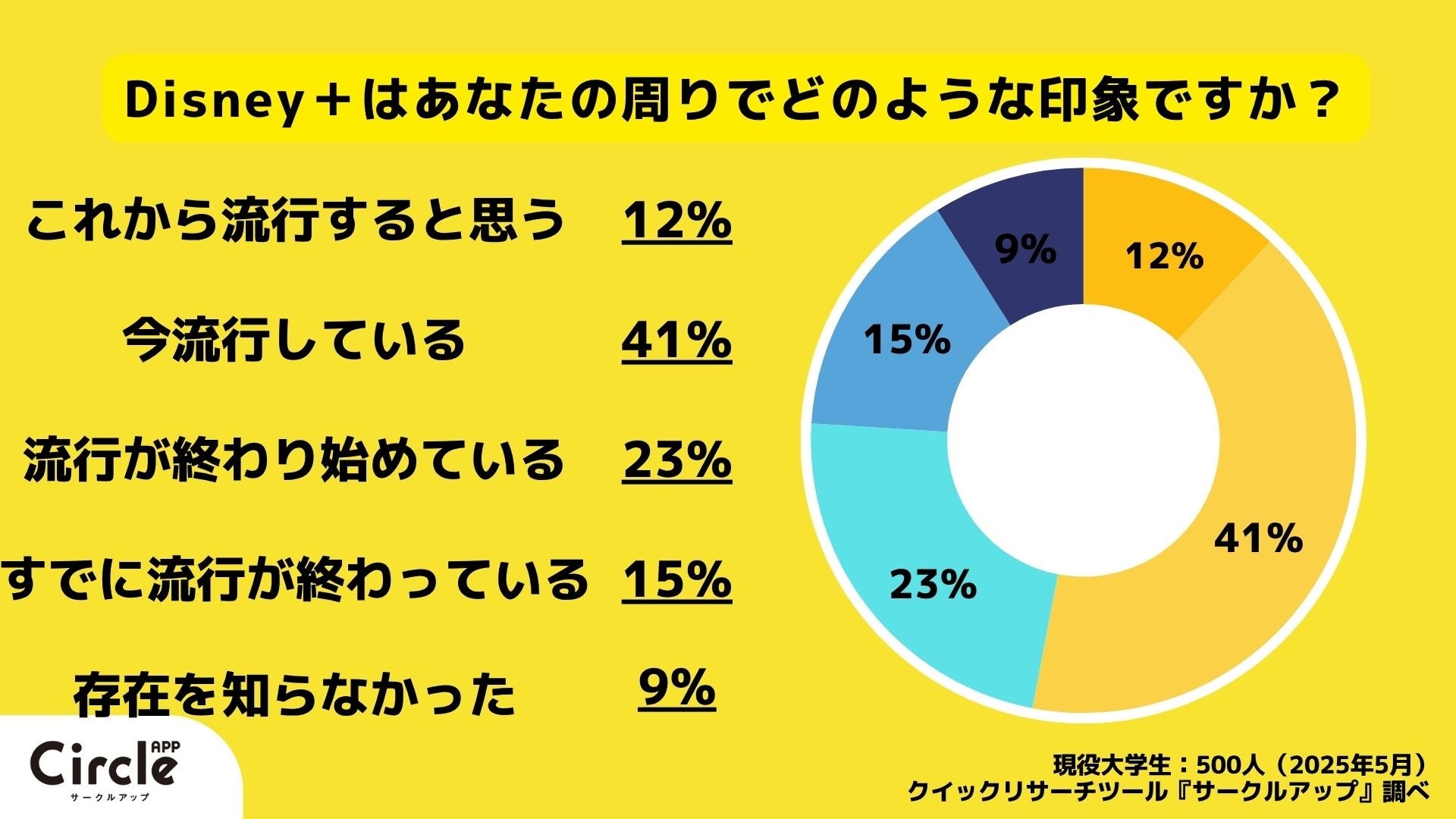 Disney+はあなたの周りでどのような印象ですか?という質問に対し、これから流行すると思うと回答した人は12%、今流行していると回答した人は41%、流行が終わり始めていると回答した人は23%、すでに流行が終わっていると回答した人は15%、存在を知らなかったと回答した人は9%でした。
