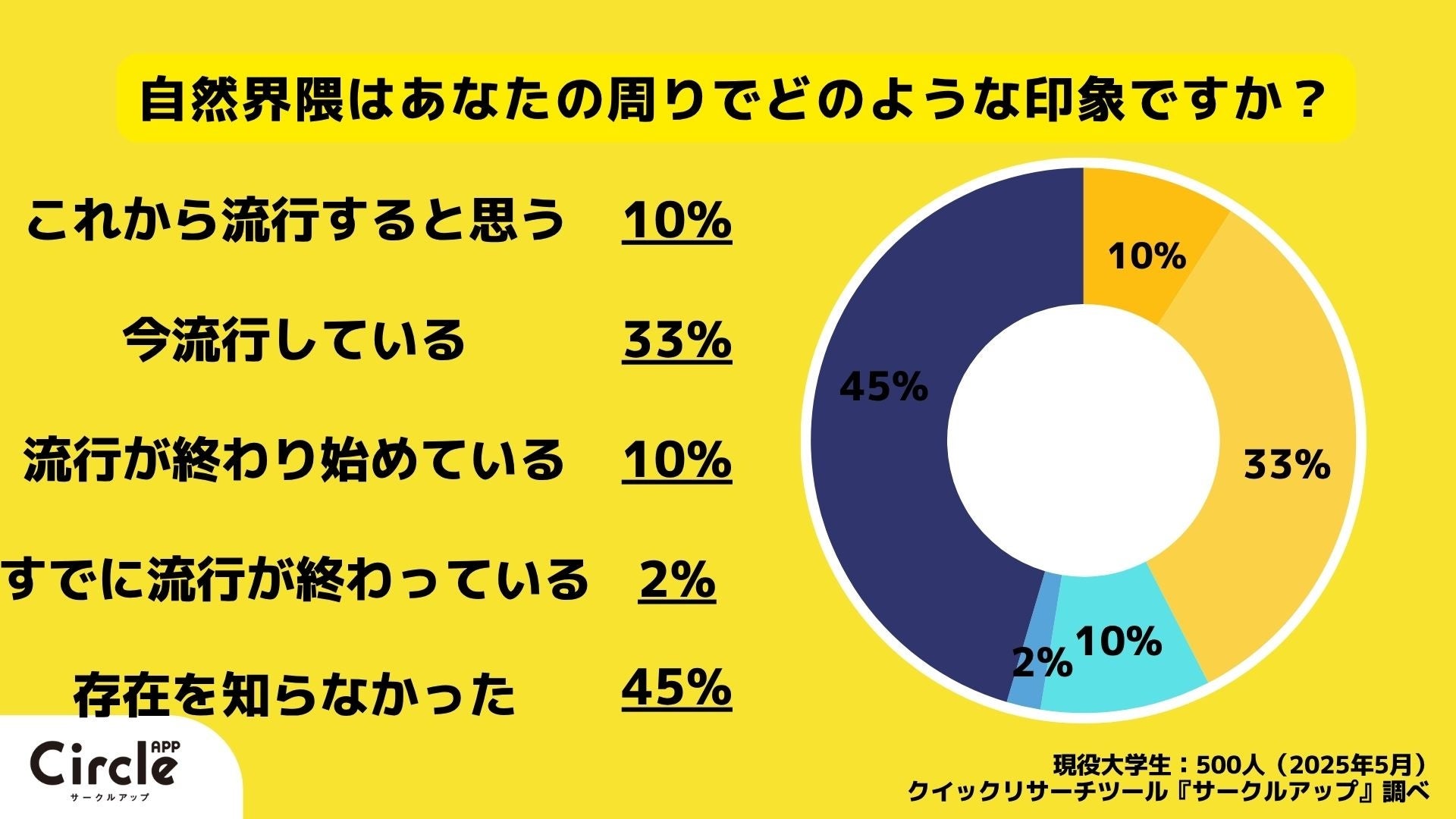 自然界隈はあなたの周りでどのような印象ですか?という質問に対し、これから流行すると思うと回答した人は10%、今流行していると回答した人は33%、流行が終わり始めていると回答した人は10%、すでに流行が終わっていると回答した人は2%、存在を知らなかったと回答した人は45%でした。