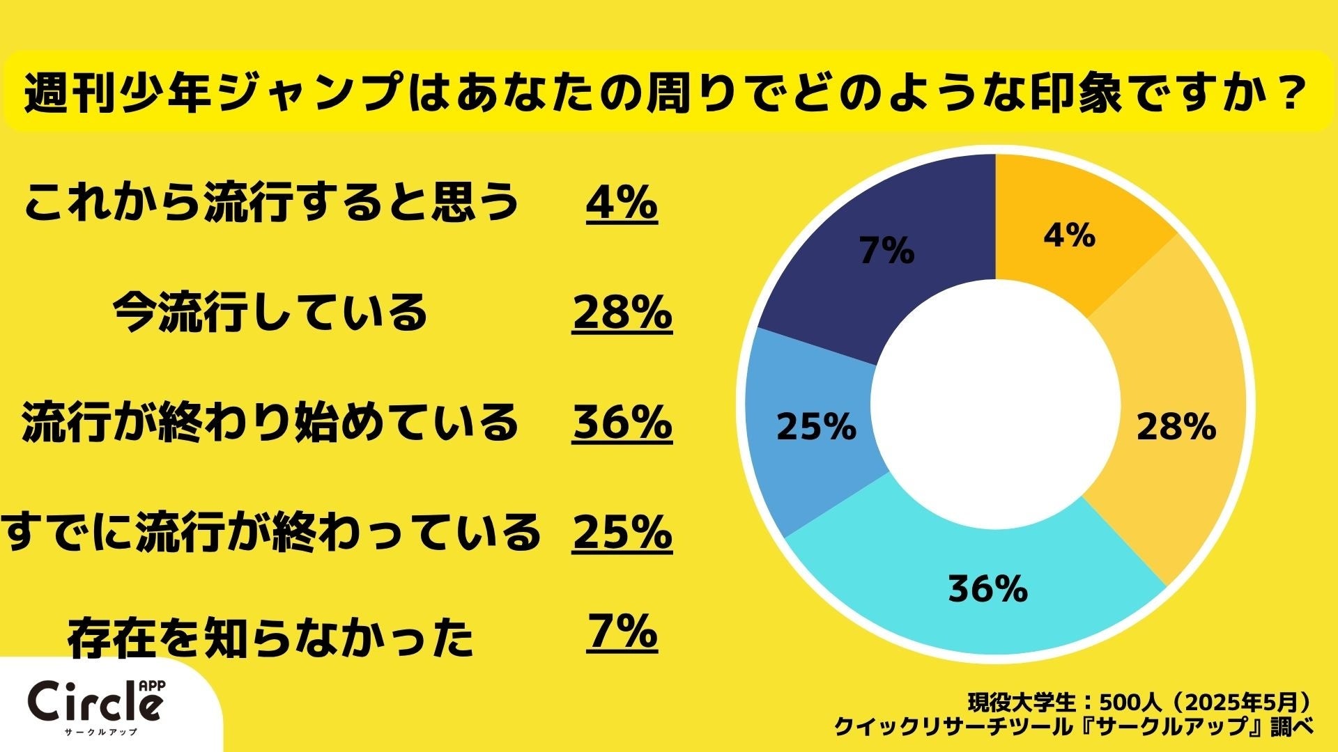 週刊少年ジャンプはあなたの周りでどのような印象ですか?という質問に対し、これから流行すると思うと回答した人は4%、今流行していると回答した人は28%、流行が終わり始めていると回答した人は36%、すでに流行が終わっていると回答した人は25%、存在を知らなかったと回答した人は7%でした。