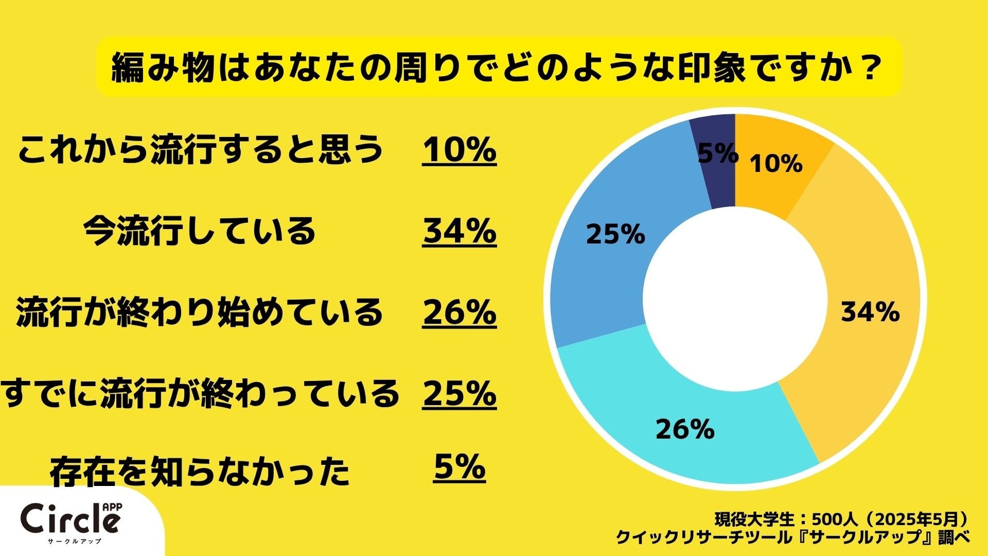 編み物はあなたの周りでどのような印象ですか?という質問に対し、これから流行すると思うと回答した人は10%、今流行していると回答した人は34%、流行が終わり始めていると回答した人は26%、すでに流行が終わっていると回答した人は25%、存在を知らなかったと回答した人は5%でした。