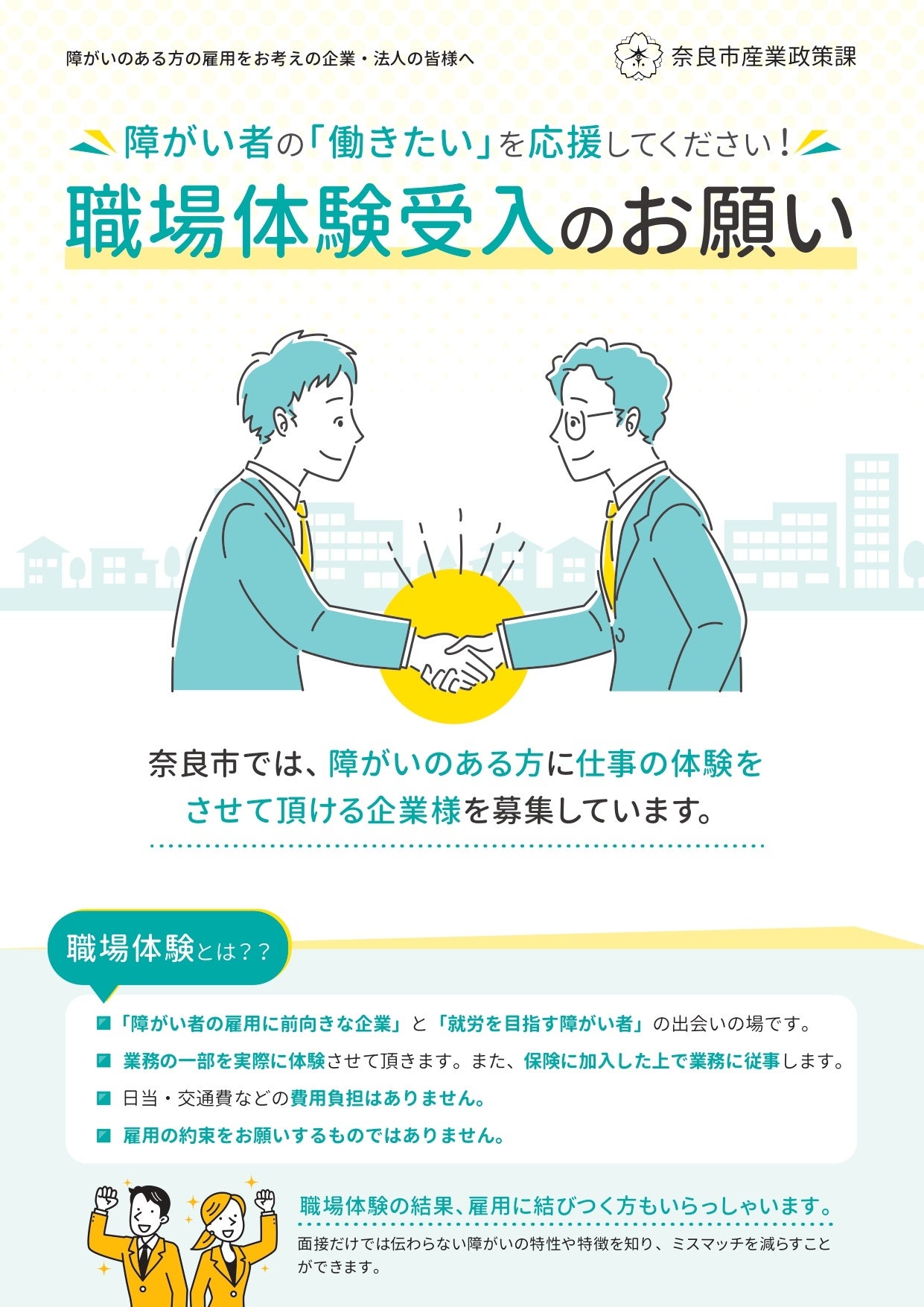 奈良市は、障害者が本人の能力や適性に応じた職業に就き、自立した生活ができるよう、その働く機会や職域の拡大を目指し、市内企業との職場体験実習(※)のマッチングに取り組んでまいりました。
