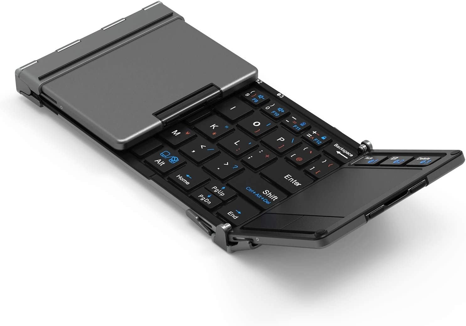 Bluetooth接続で最大3台までのマルチペアリングが可能です。キーボードを開くと自動的に電源がONになり、折りたたむとOFFになる省エネ設計です。キーボードを折りたためば、スマホ感覚で持ち運びができ、営業マンの味方になります。トラックパッドを搭載しているため、マウス不要でタブレットやスマホがノートパソコンのように使用できます。