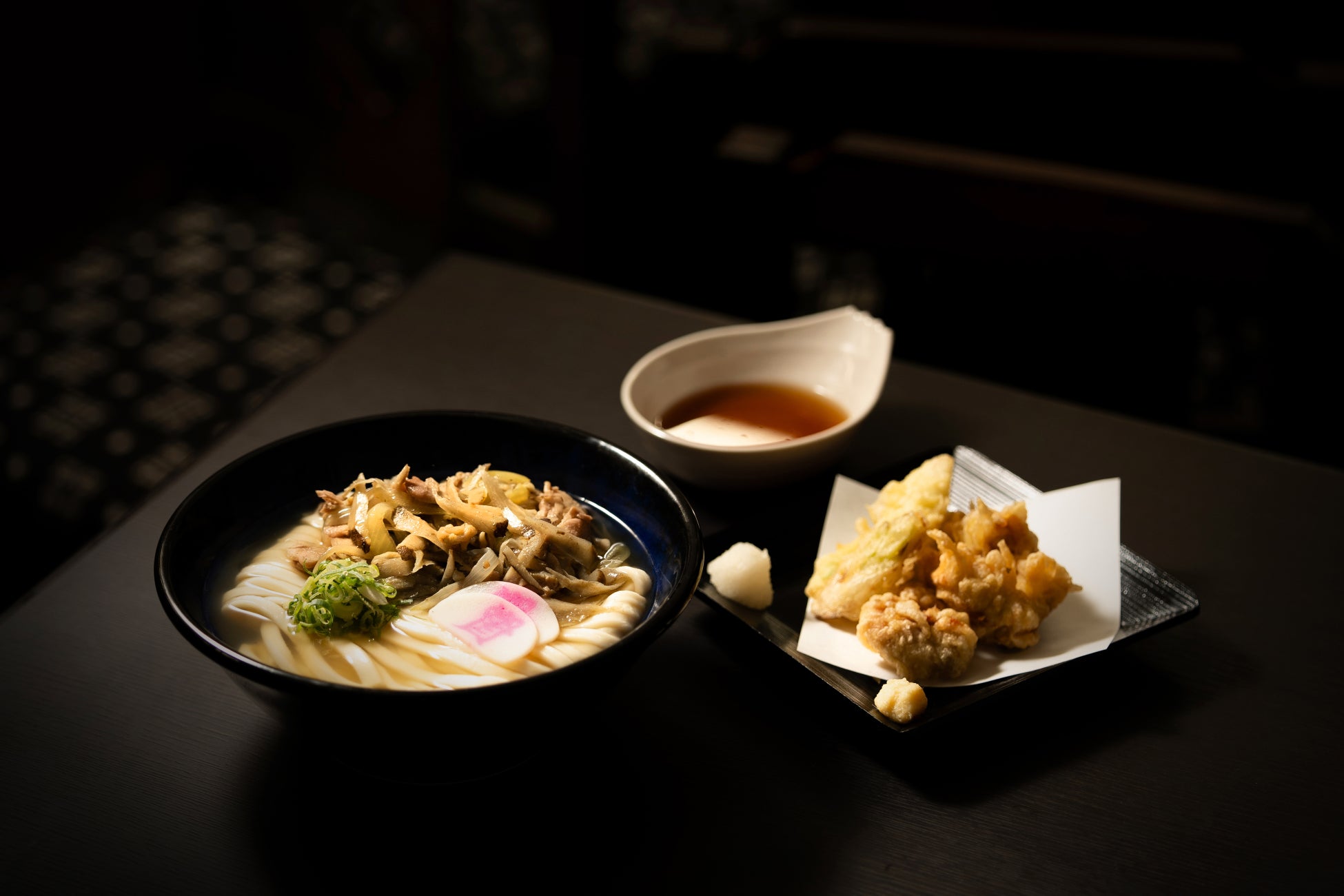 王道の「かしわ汁うどん」とご一緒にお召上がりいただきたいのが、相性ピッタリの「天ぷらの盛り合わせ」。外はサクサク、中から溢れ出すジューシーな肉汁が自慢の「鶏天」に、独特な甘さとトロッとした食感も楽しい「白葱の天ぷら」をチョイス。スパイシーな「かしわ汁うどん」に「とり天」の重層的な旨味、「白葱」の素材の甘みをプラスして、多彩な味わいのハーモニーをご堪能いただけます。