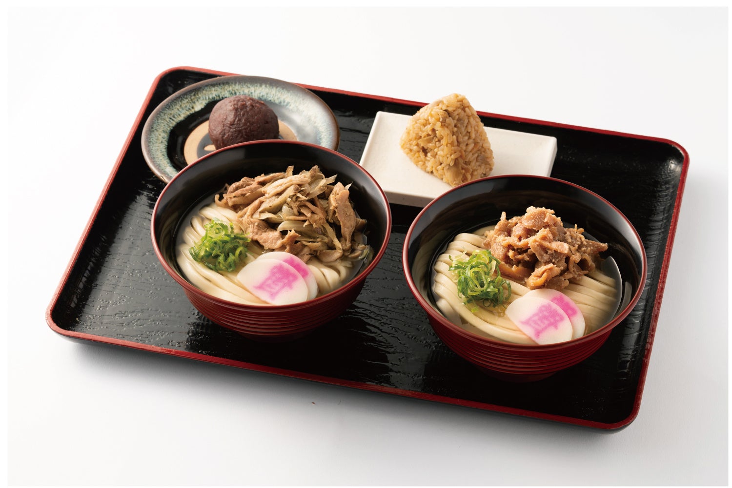 セット内容:ミニかしわうどん、ミニかしわ汁うどん、かしわおにぎり、ミニぼた餅※なしも選べます。