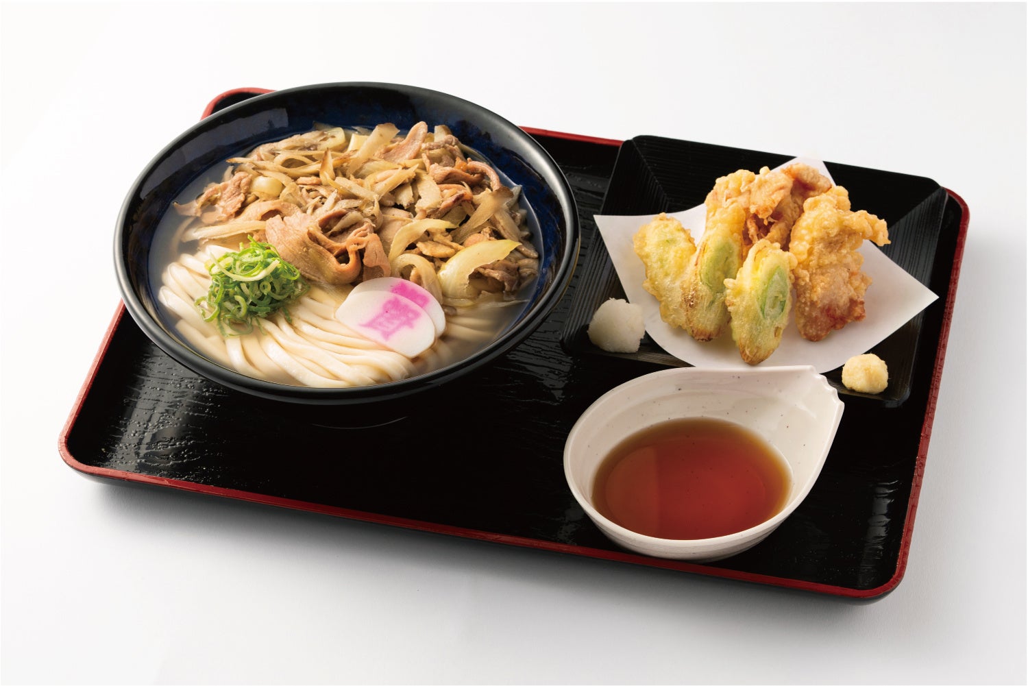 塩・こしょうでスパイシーに炒めた「かしわ」、「ごぼう」、「玉ねぎ」とともに「出汁」と「うどん」を味わう一品。惜しまれつつ終売した今でもなお、根強い人気を誇るメニューが期間限定で復刻します。ジューシーな味わいが人気の「鶏天」、とろっとした食感と独特の甘みを感じる「白葱」の天ぷらを合わせた「天ぷらセット」がおすすめです。