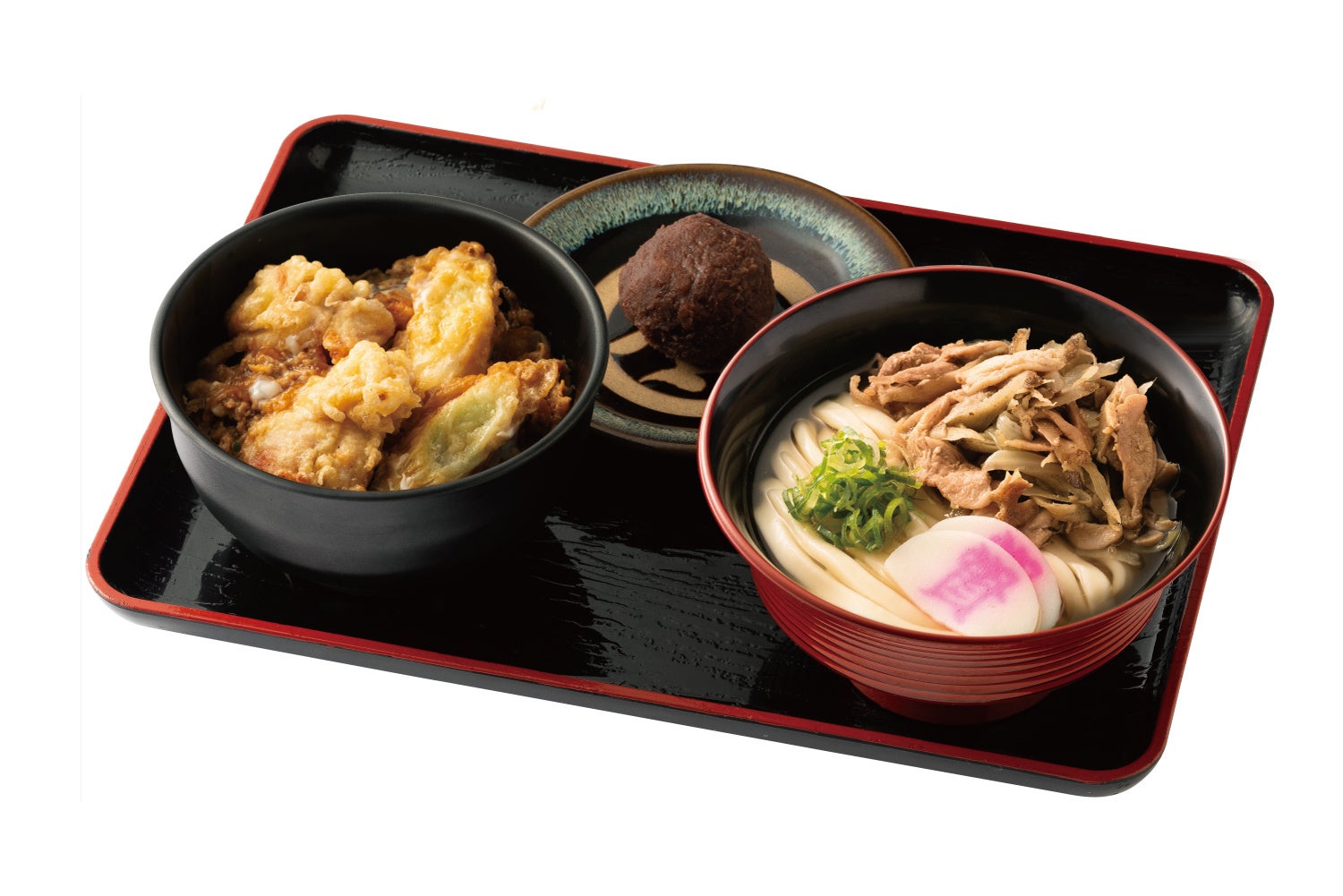 セット内容:かしわ汁うどん、天ぷら盛り合わせ(鶏天3個・白葱3個)