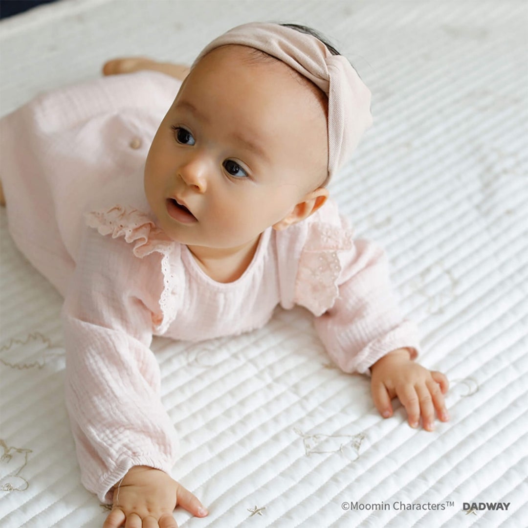 家族の毎日を温かく彩るMOOMIN BABY。当社が手掛ける商品は、大人の暮らしにも馴染むやわらかなテイストが魅力。掛けたり、敷いたり、多用途に使えるキルトケットは、ホワイト生地にシャンパンゴールドの刺繍でムーミンがデザインされています。リボン掛けパッケージで、出産祝いギフトにもおすすめです。
