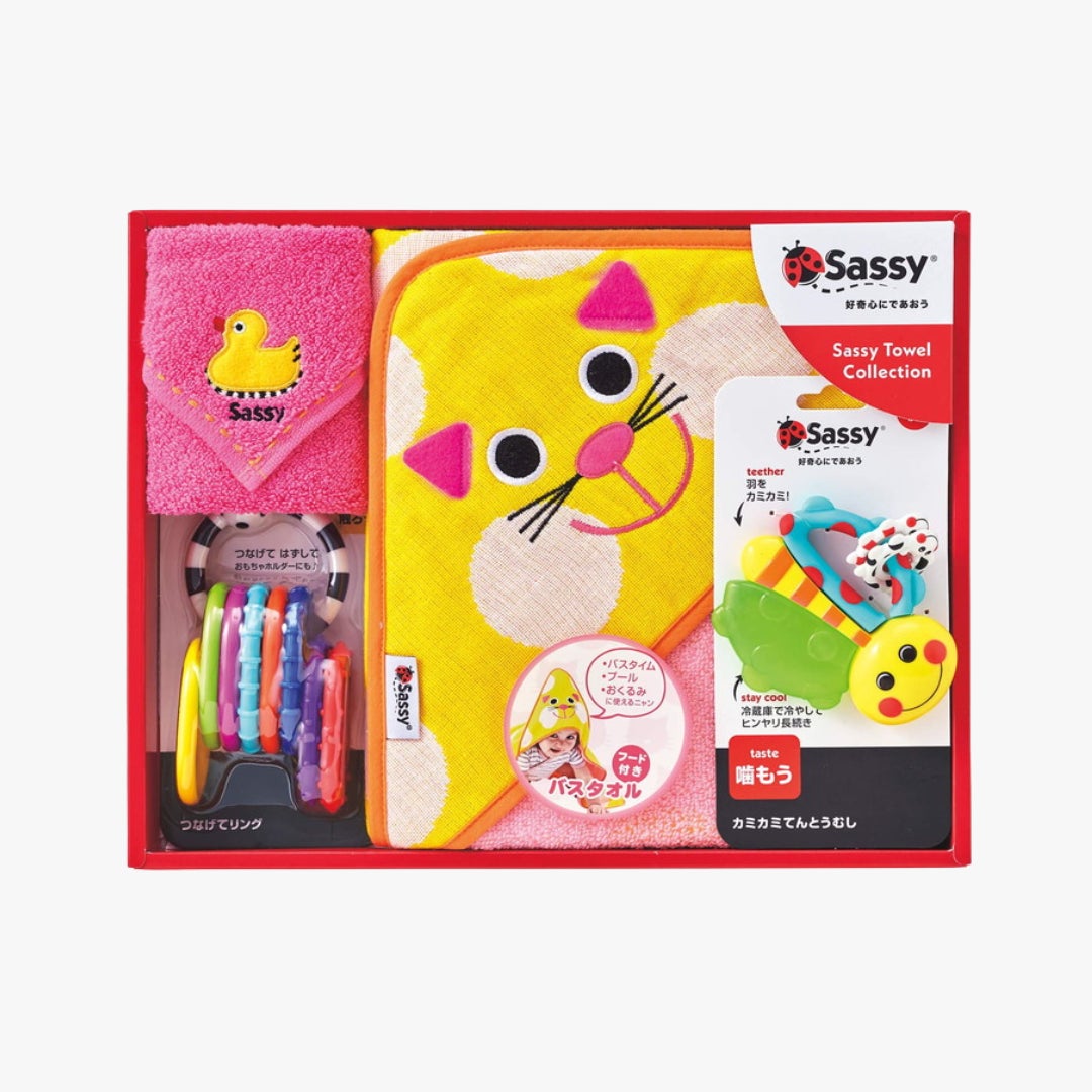 アメリカ生まれのSassyは「好奇心にであおう」をコンセプトに、赤ちゃんの興味を引きつけ、持って生まれた能力を引き出すアイテムを展開しています。児童発達心理学の観点から誕生した、色鮮やかでにこにこ笑顔のおもちゃやタオルを合わせた、出産祝いにぴったりのギフトセット4種類をご用意しています。