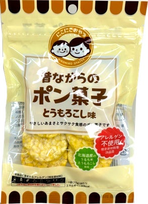 商品特徴:お米のやさしい甘さとサクサク食感のポン菓子です。北海道産のうるち米、とうもろこしパウダーを使用。