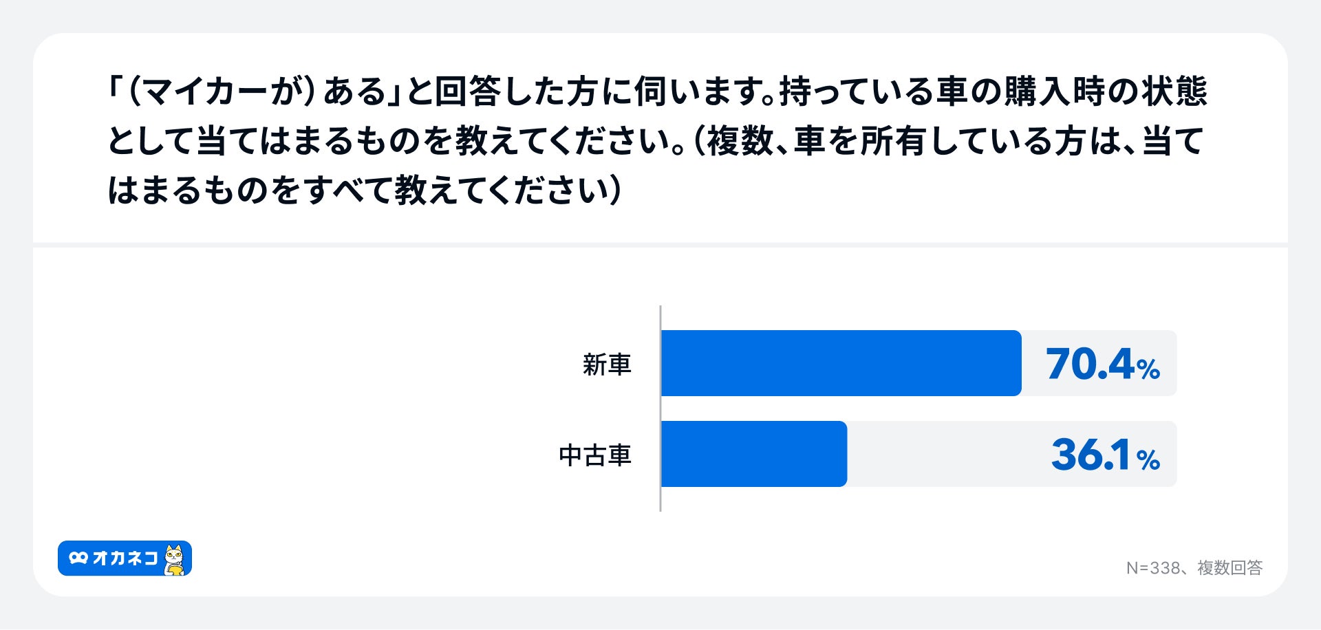 「持っている車の購入時の状態として当てはまるものを教えてください」と質問したところ「新車」70.4%、「中古車」36.1%となりました。