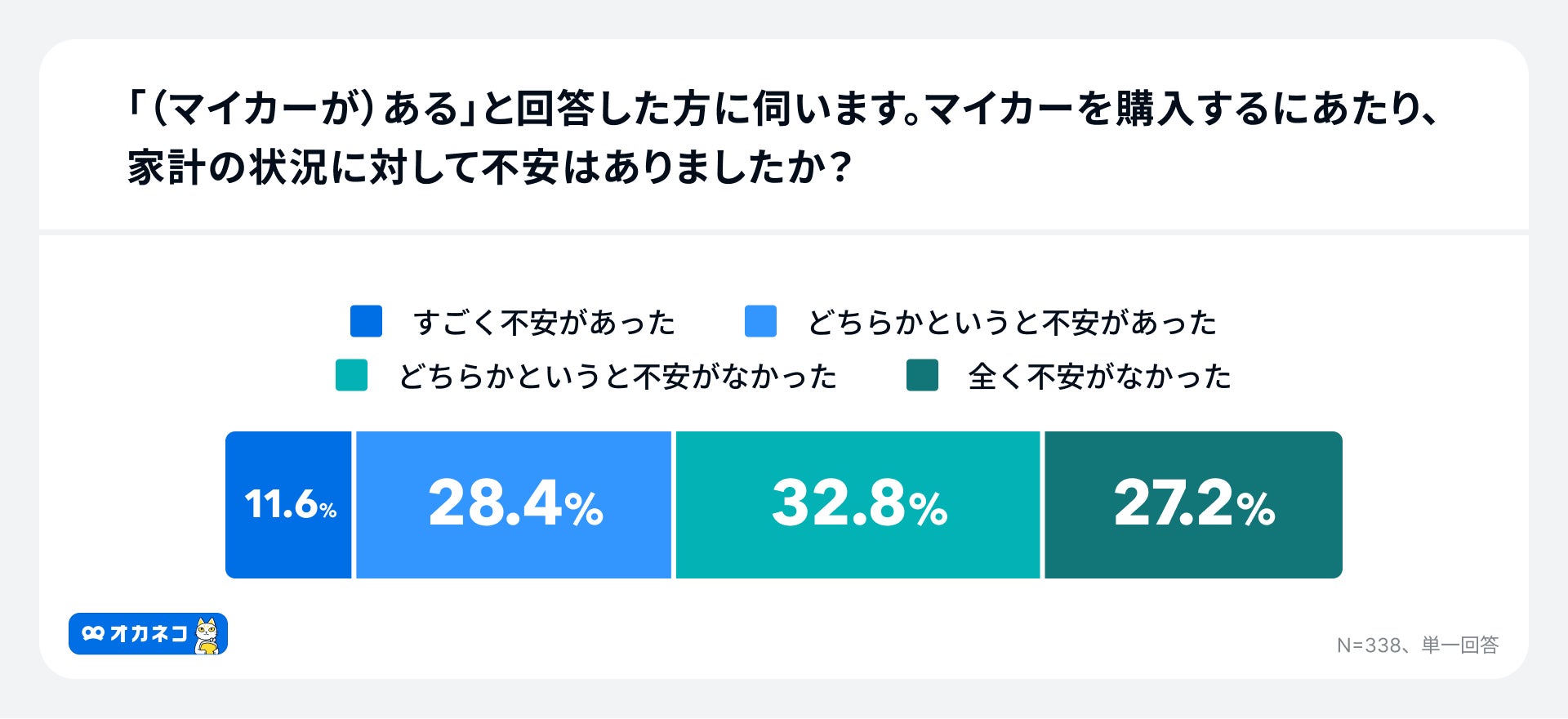 調査対象者の中から「マイカーがある」と回答した方へ「マイカーを購入するにあたり、家計の状況に対して不安はありましたか」と質問したところ「不安があった」と回答した方は40.0%(「すごく不安があった」11.6%、「どちらかというと不安があった」28.4%)となりました。