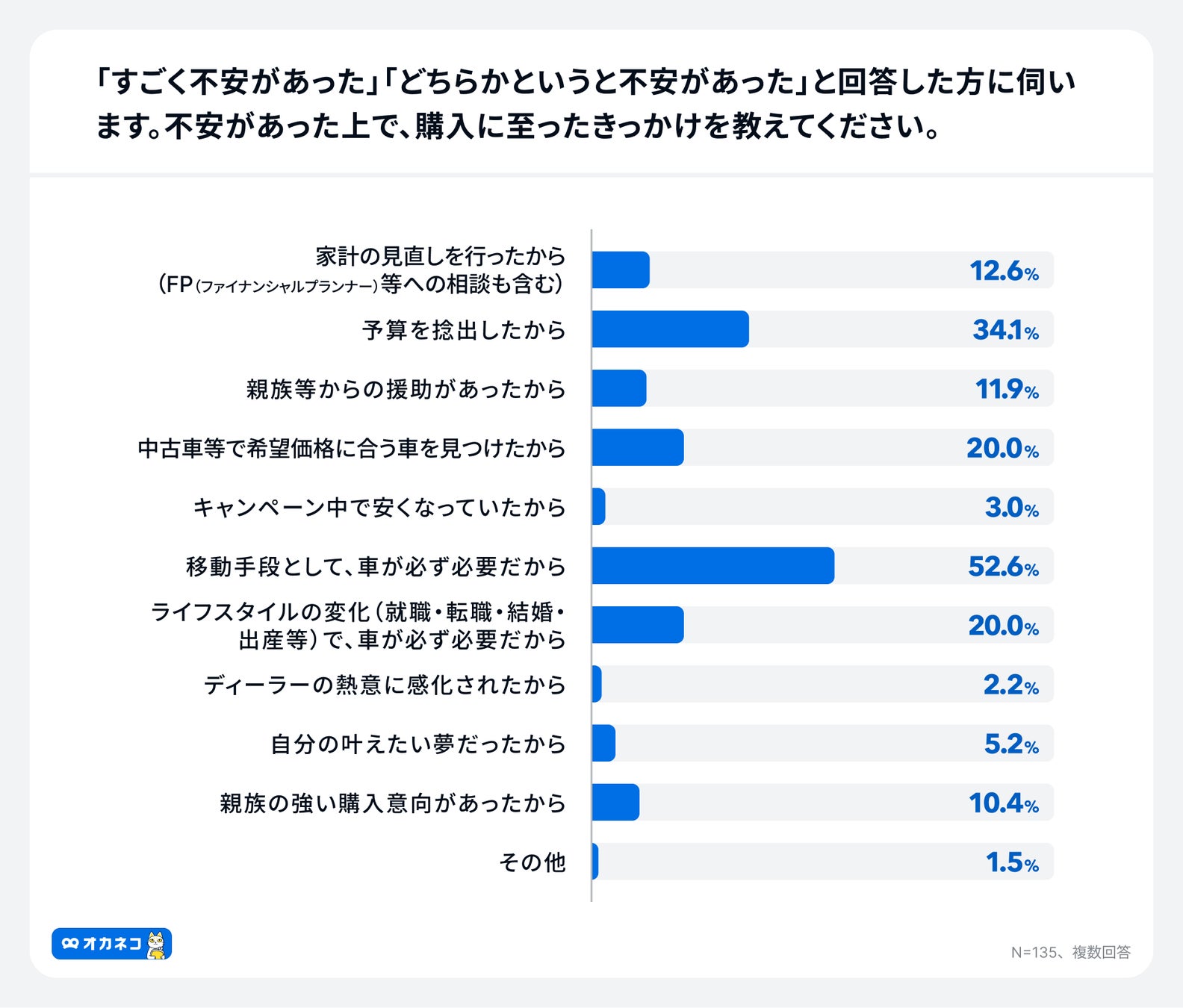 「不安があった」と回答した方へ「不安があった上で、購入に至ったきっかけを教えてください」と質問したところ、「移動手段として、車が必ず必要だから」52.6%、「予算を捻出したから」34.1%、「中古車等で希望価格に合う車を見つけたから」「ライフスタイルの変化(就職・転職・結婚・出産等)で、車が必ず必要だから」20.0%といった回答から順に多くあがり、必要に迫られマイカーを検討する中で、家計状況を鑑みながら工夫を凝らし購入へと繋げていることが伺えます。