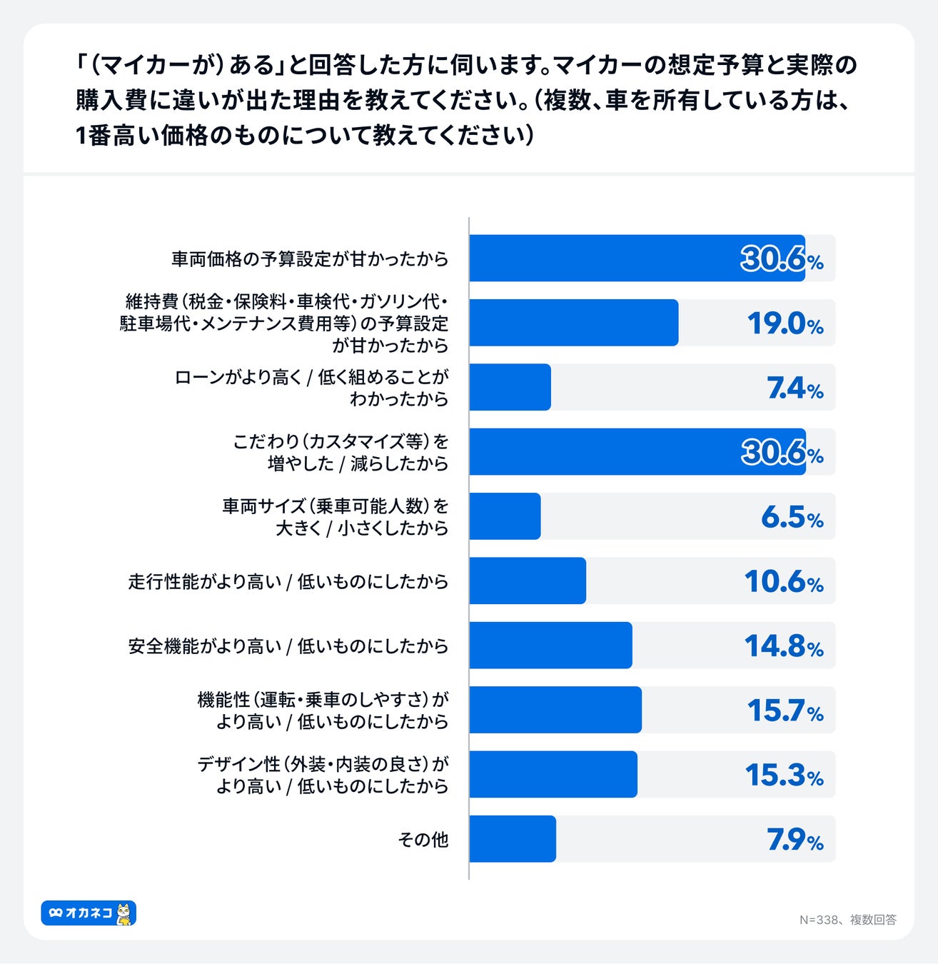 さらにその理由に関して質問したところ「車両価格の予算設定が甘かったから」「こだわり(カスタマイズ等)を増やした/減らしたから」30.6%、「維持費(税金・保険料・車検代・ガソリン代・駐車場代・メンテナンス費用等)の予算設定が甘かったから」19.0%といった回答が順に多く上がりました。正確に見積もりをたてることの難しさ、そしてマイカーを購入する中で妥協したくない点が出てきたことで予算オーバーをしてしまう方が多いことが伺えました。