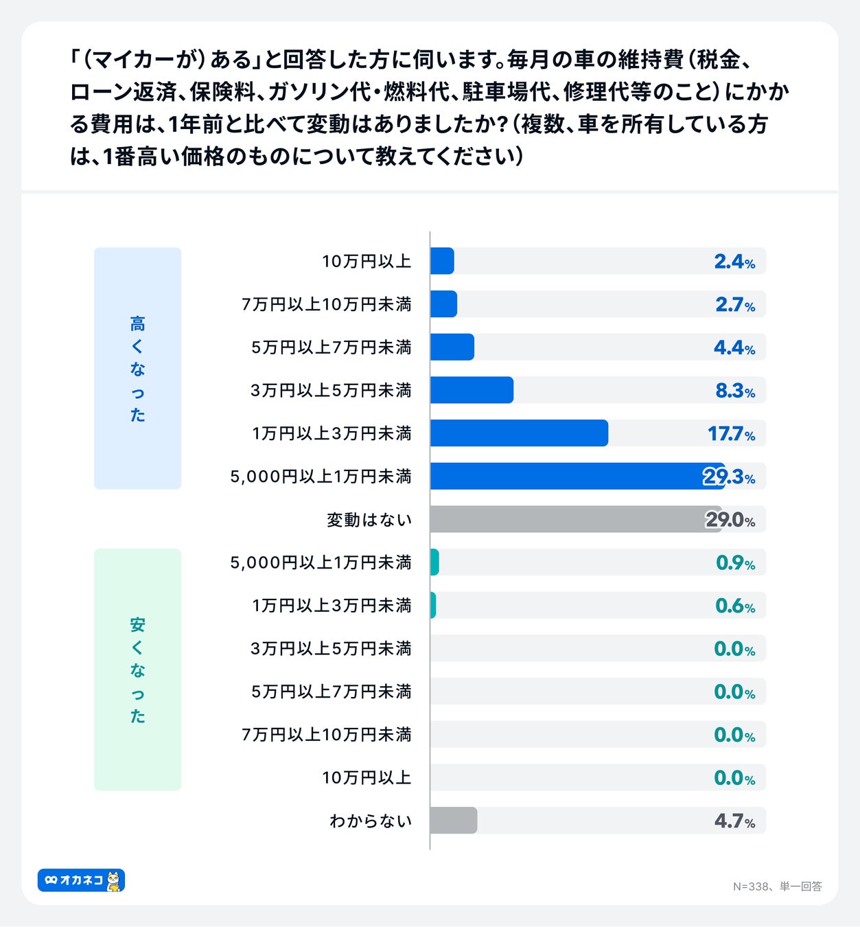 さらに「毎月の車の維持費にかかる費用は、1年前と比べて変動はありましたか。(複数、車を所有している方は、1番高い価格のものについて教えてください)」と質問したところ、「1年前と比べて維持費が高くなった」と回答した方は全体の64.8%にのぼり、特に「5,000円以上1万円未満」増加と答えた方が29.3%と最多でした。「1万円以上3万円未満」も17.7%と高く、維持費の上昇傾向が明らかになっています。ガソリン代の高騰が続く(※3)中、マイカー維持費の家計への影響が一段と強まっていることがうかがえます。