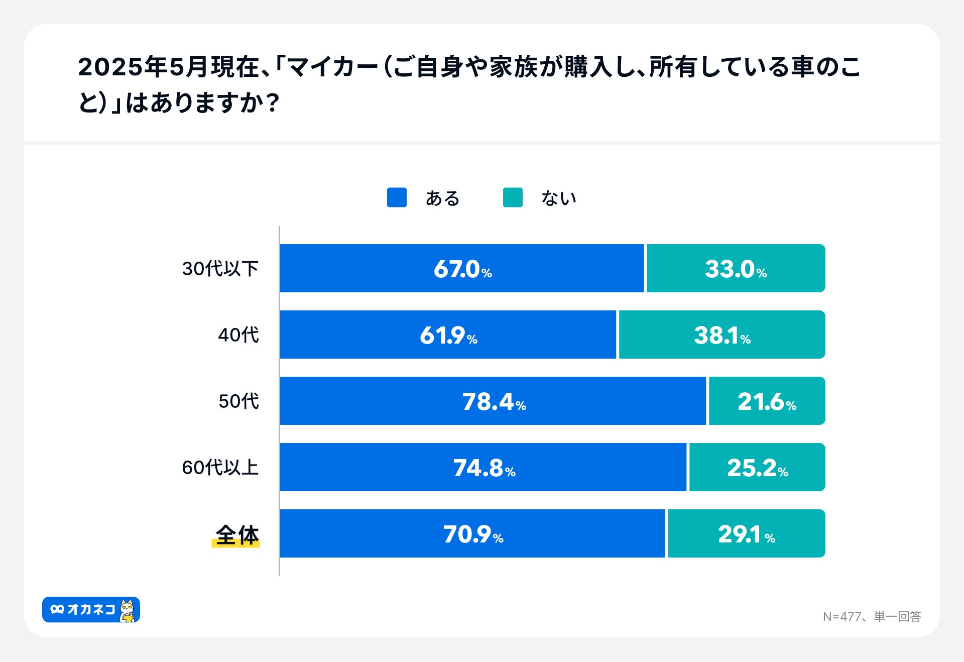 調査対象者のうち、マイカーがあると回答した方は70.9%でした。年代別の所有率は、30代以下67.0%、40代61.9%、50代78.4%、60代以上74.8%と、全年代で所有率が半分を超える結果となりました。