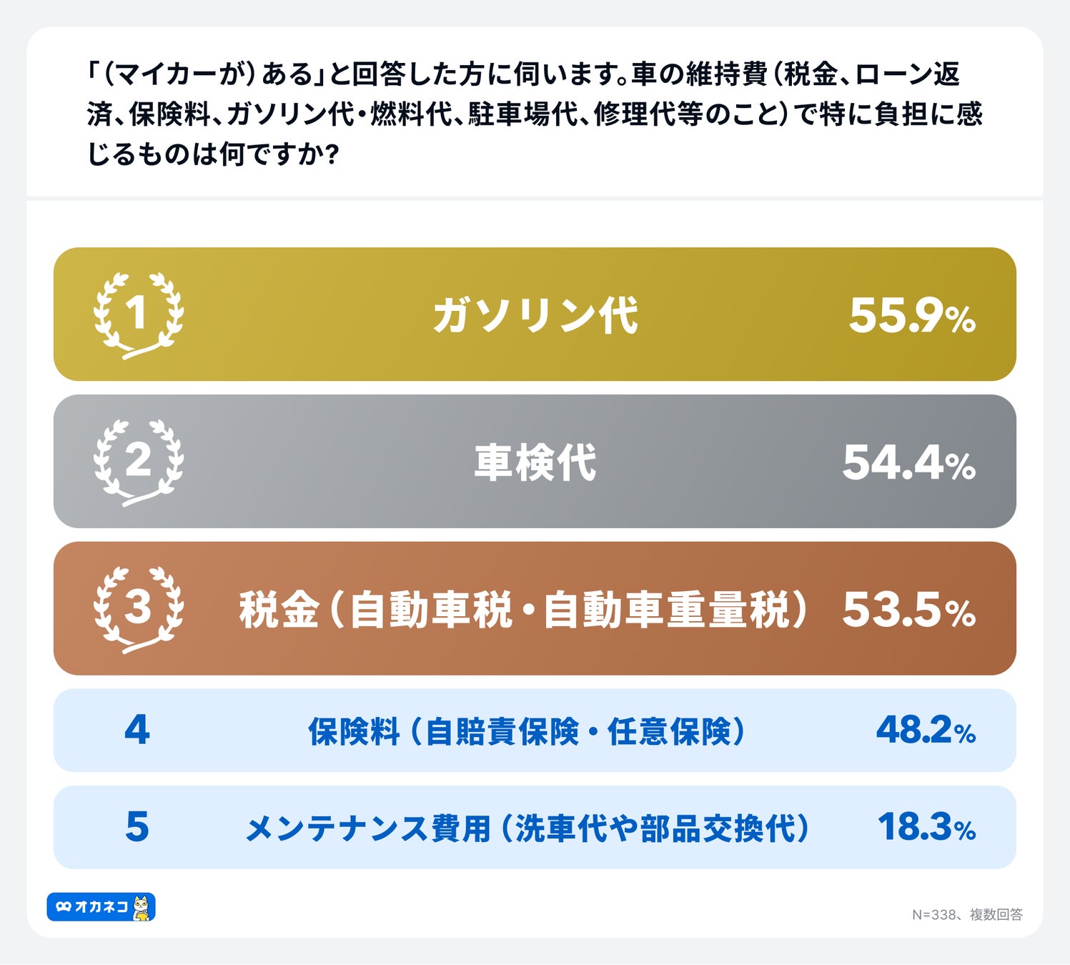 次いで「車の維持費で特に負担に感じるものは何ですか」と質問したところ、「ガソリン代」55.9%、「車検代」54.4%、「税金(自動車税・自動車重量税)」53.5%の順に多く、上位3項目は半数以上が負担に感じていることがわかりました。