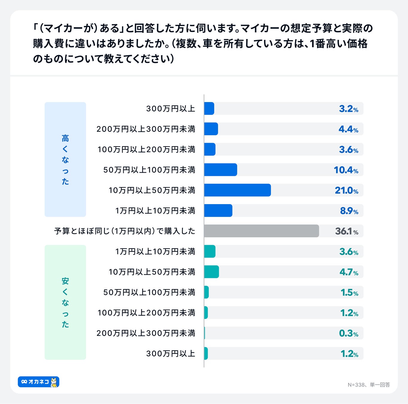 「マイカーがある」と回答した方へ「マイカーの想定予算と実際の購入費に違いはありましたか。(複数、車を所有している方は、1番高い価格のものについて教えてください)」と質問したところ「高くなった」と回答した方が51.5%(1万円以上10万円未満8.9%、10万円以上50万円未満21.0%、50万円以上100万円未満10.4%、100万円以上200万円未満3.6%、200万円以上300万円未満4.4%、300万円以上3.2%)と、予算オーバーでマイカーを購入した方が半数以上であることがわかりました。