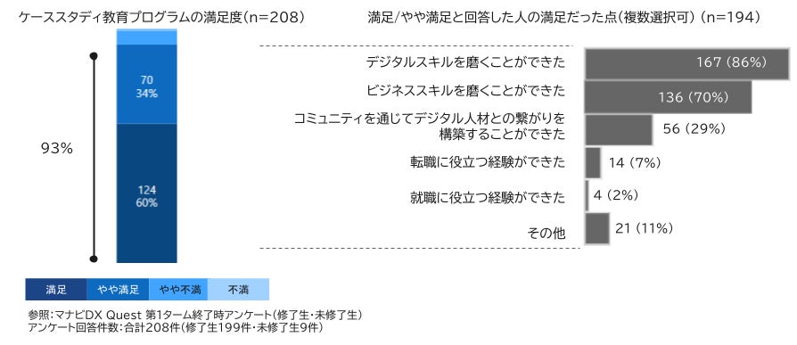 ケーススタディ教育プログラムの受講生満足度は93%を達成しました。アンケート結果では、デジタルおよびビジネススキルの両面で高い学習効果が得られたことが確認されており、本プログラムが企業のDX推進を担うデジタル人材の育成に効果的であることが示されています。