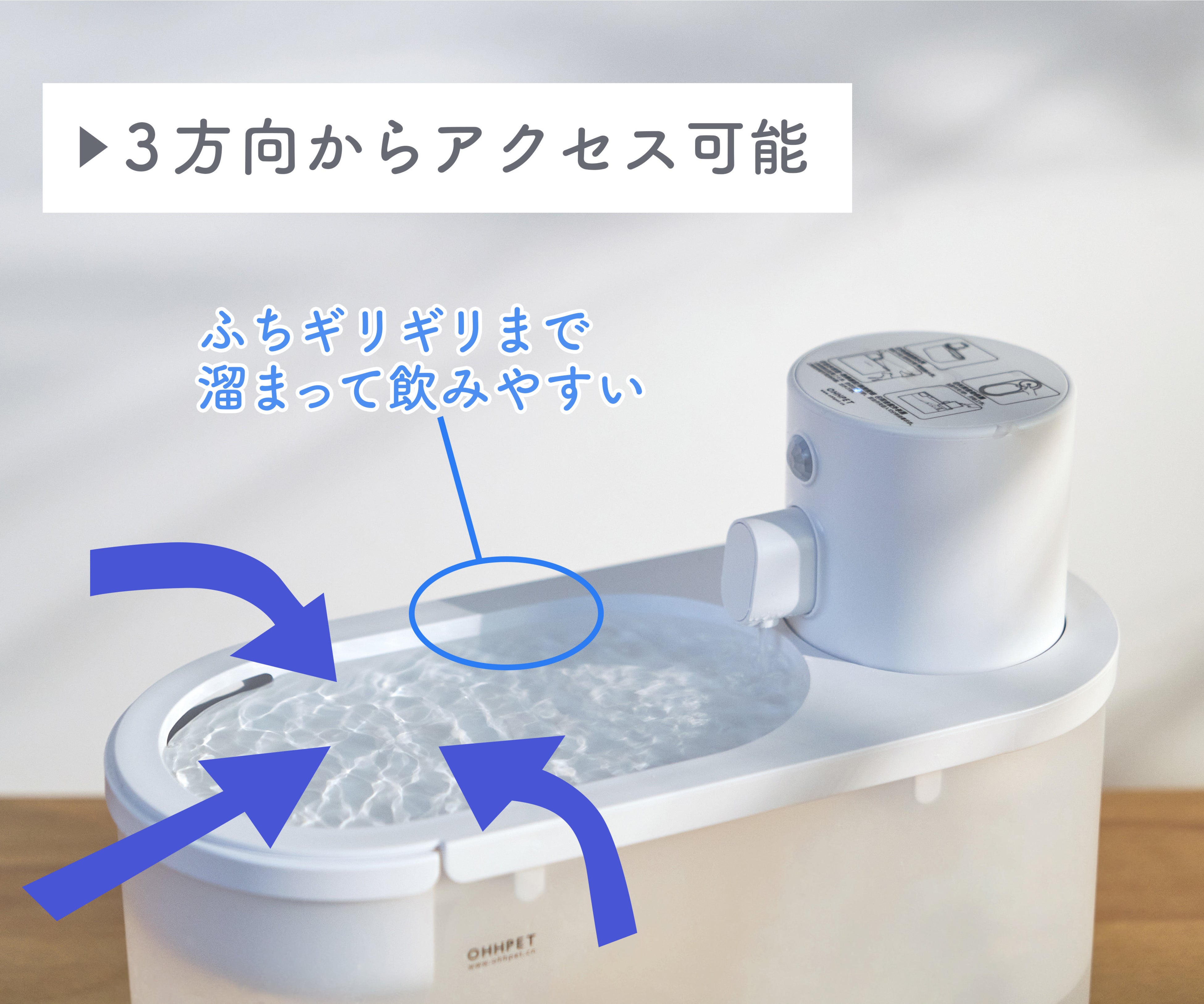 水のみ皿はペットがアクセスしやすいよう3方向から水を飲むことができ、水が皿のふちギリギリまで溜まり溢れる前に一定量で排水されます。