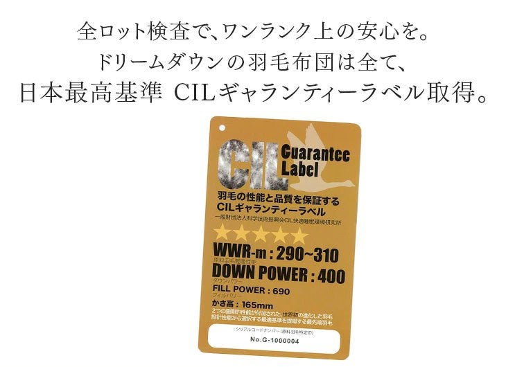 CILギャランティラベルとは、日本で唯一の羽毛専門の検査研究機関CIL(快適睡眠環境研究所)が発行している品質検査の証明になります。