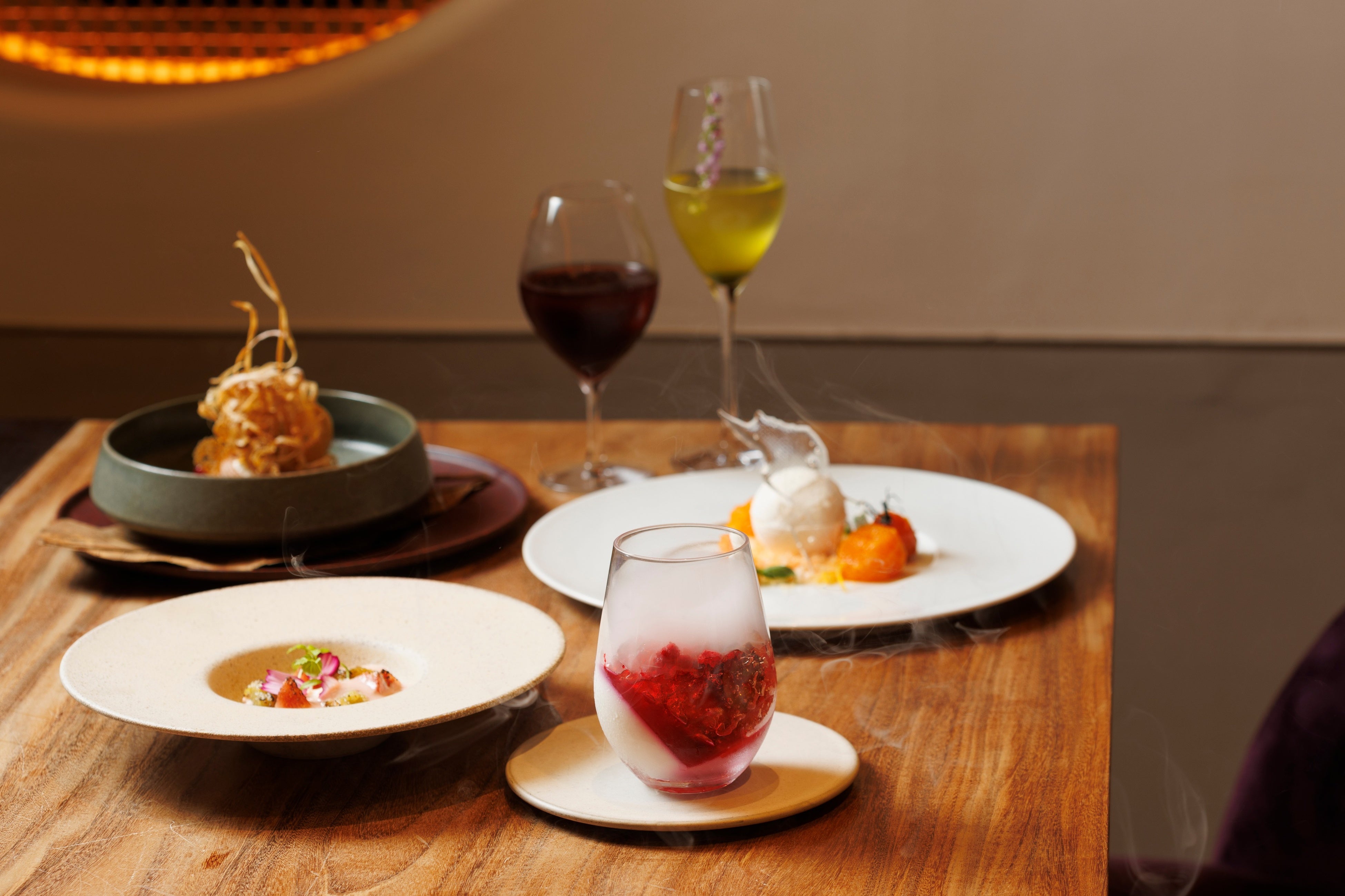 「デザートコース」は京都伏見の山田ファームから届いた無農薬の紫蘇やビーツ、京都美山の牛乳を使ったラテコッタを層にした【ビーツと紫蘇、葡萄のドルチェ】、柑橘のメレンゲのドームに閉じ込めたヨーグルトエスプーマをザクザク崩しながら、まるでフルーツのような甘みのミニトマトと合わせる【オレンジトマトとマイヤーレモンのドルチェ】や京都大原のニコファームのごぼうが主役の【ごぼうと栗のドルチェ】など素材の旨味を最大限に活かしたコースをご用意しました。