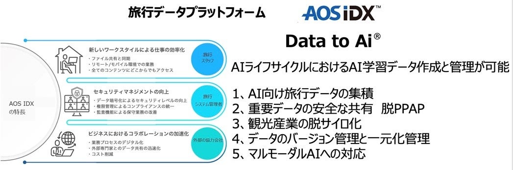 クラウドデータ、システムデータ、リーガルデータ、AIデータなどのデータアセットマネジメント事業を展開するAOSデータ株式会社(本社:東京都港区、代表取締役社長 春山 洋 以下 AOS データ社)は、旅行業界や観光業における効率化が求められている日本において、旅行テックで多種多様な情報を共有、保存できる旅行データプラットフォームの構築を支援し、AIによるデータ分析や活用につなげることができる「旅行データプラットフォームAOS IDX」(https://AOSIDX.jp/)のInside実装サービスを、2023年3月30日より販売開始することをお知らせします。