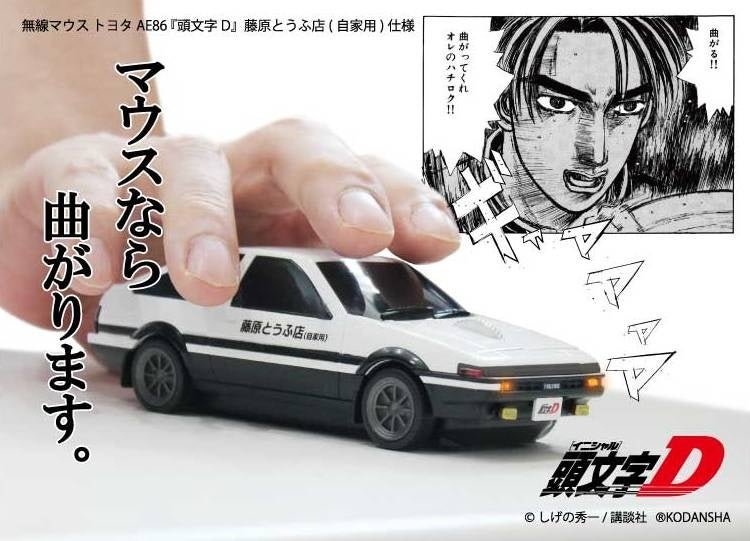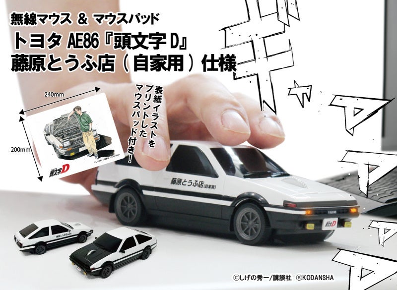 ラインナップは前期版、ブラックボンネットの後期版の2種類で、主人公の藤原拓海が作中で運転するAE86の車体を再現した無線マウスは、スイッチを入れることでヘッドライト・リアライトを点灯させることも可能。