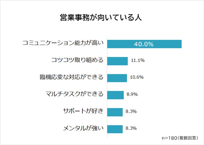 経験者180人に営業事務はどんな人に向いていると思うかを聞いたところ、ダントツは「コミュニケーション能力が高い(40.0%)」で、全体の4割を占めました。