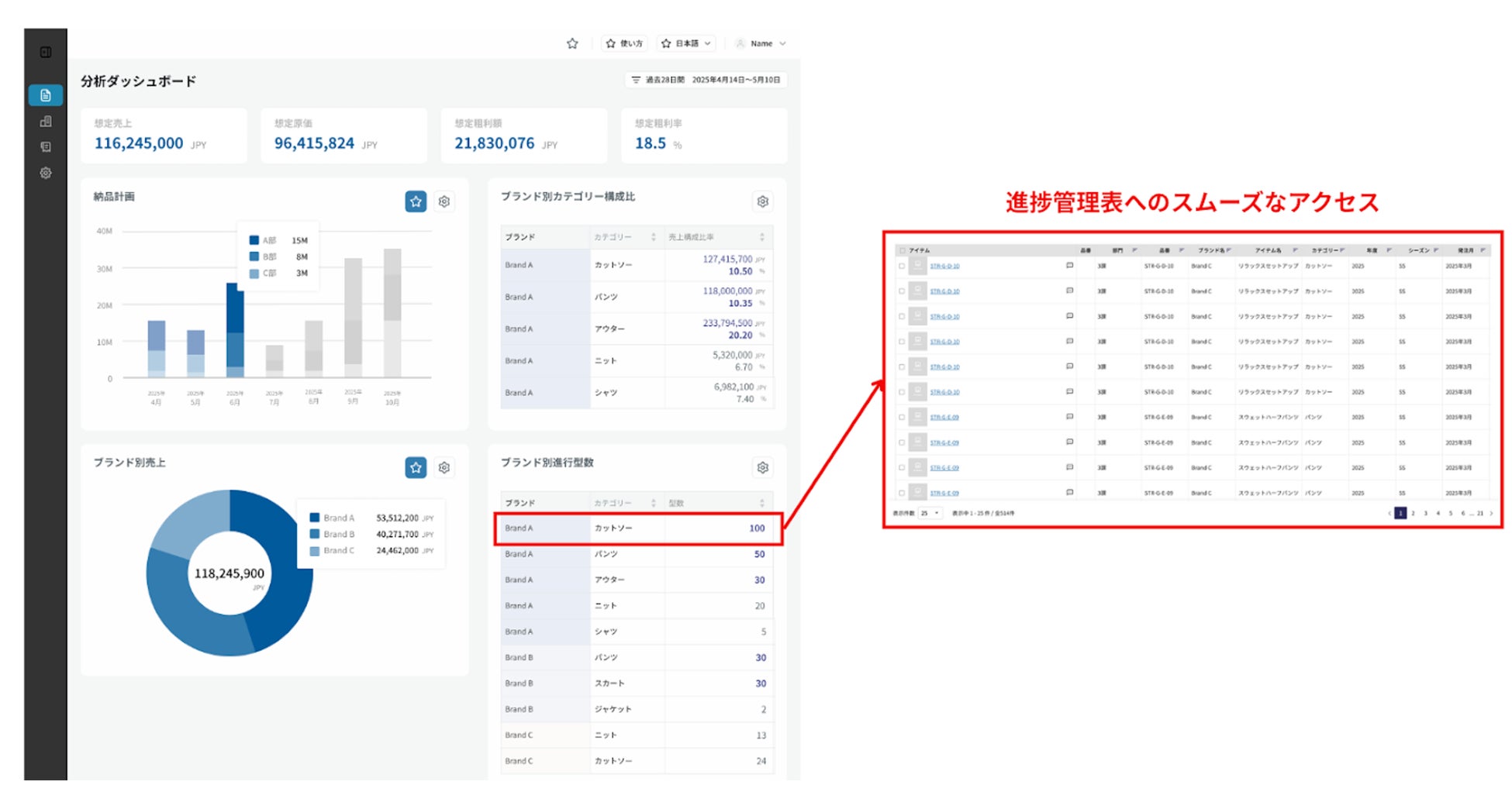 この機能ではsitateru CLOUD上で管理されている企画情報、生産情報、発注情報などをもとに、売上計画や支出管理などの可視化を実現します。従来、Excelで個別に行われがちだった予実管理やMD分析を効率化し、業務全体の生産性向上を支援します。