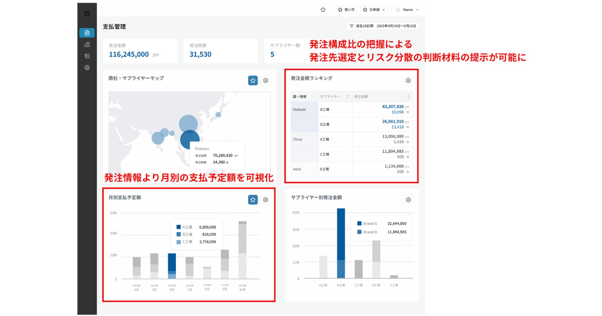 発注情報とサプライヤー情報から月別の支払い予定を可視化。予算に対する支出の進捗を管理することで、資金繰りやキャッシュフローの見通しを支援。