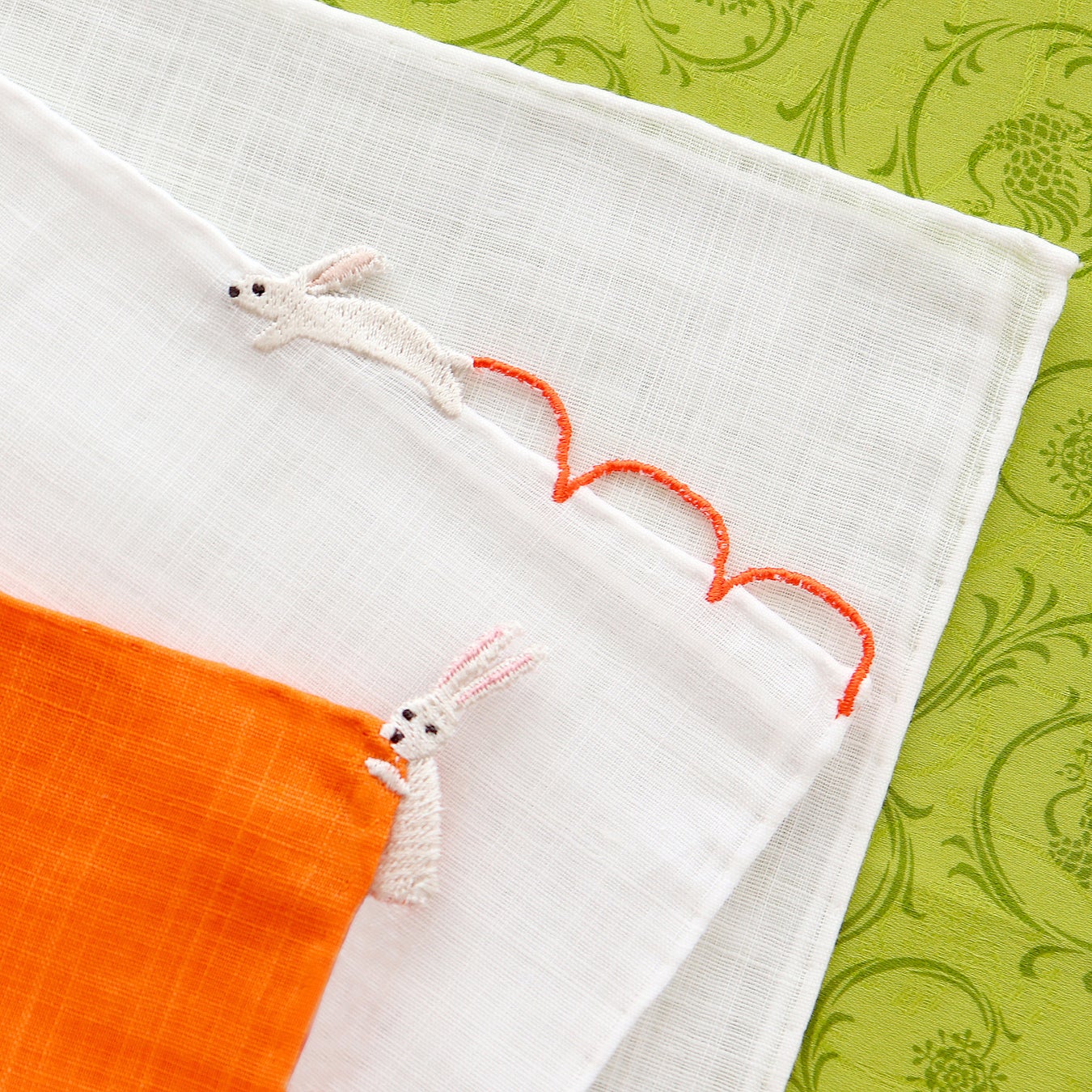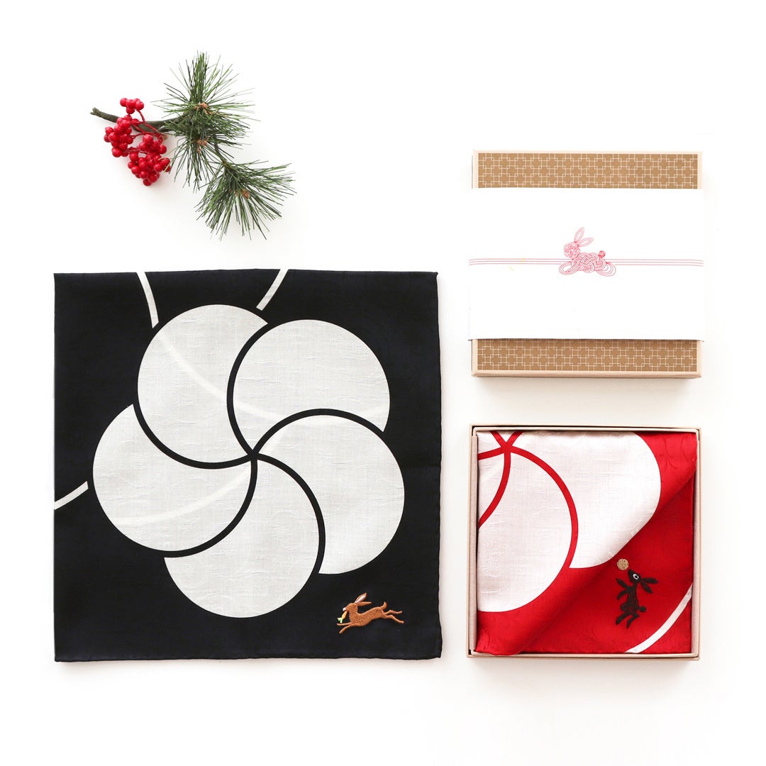 和柄の「ねじり梅」のハンカチーフに、うさぎのモチーフ刺繍をお入れして、新年のご挨拶の贈り物に。