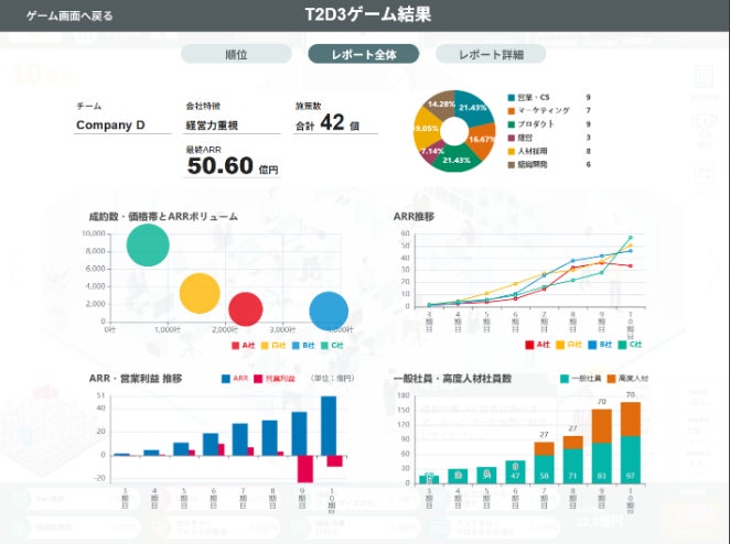 「T2D3」は、仮想のスタートアップ企業の経営者となり、時価総額や売上(ARR)の最大化を目指すシミュレーションゲームです。これまでに累計300社以上のスタートアップ企業や大手企業の新規事業部門等で導入されており、パナソニック様やNEC様といった大企業から、Hubble様、hacomono様などの急成長ベンチャーまで幅広く活用されています。