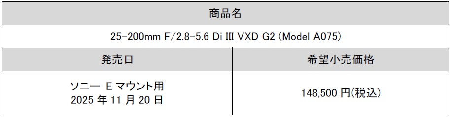 総合光学機器メーカーの株式会社タムロン(代表取締役社長:桜庭省吾、本社:さいたま市)は、フルサイズミラーレス一眼カメラ対応のソニー E マウント用高倍率ズームレンズ、「25-200mm F/2.8-5.6 Di III VXD G2(Model A075)」(以下25-200mm F2.8-5.6 G2)を2025 年11 月20 日に発売します。