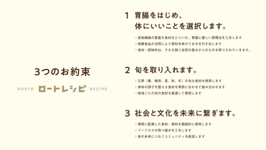お客さまに「おなかの底から元気になれる」をご体感いただくべく、独自で「3つのお約束」を制定しました。「ロートレシピ」でのメニュー・物販商品・活動・サービス等は下記のお約束をもとに開発・ご提供していきます。