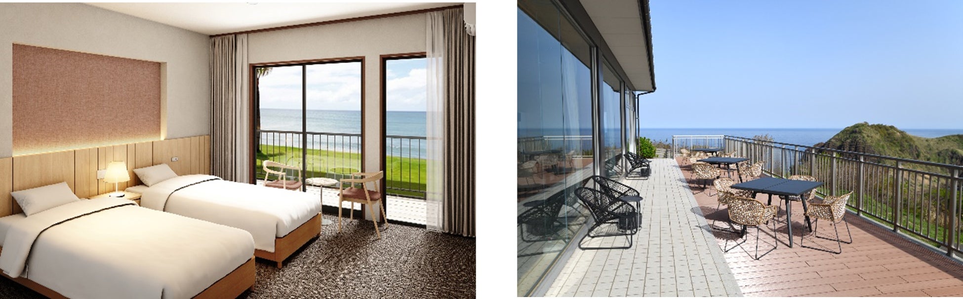 SADO二ツ亀ビューホテルは、2024年3月に客室全面リニューアル。全室海側のオーシャンビュー。シモンズ製のベッドで快適にお休みいただけます。また、ウッドデッキテラスでは二ツ亀を正面に臨みながらランチを楽しむこともできます。夕日を見ながらのカフェタイムや、夜には圧倒的な量の星も眺められるため、星空の観賞や天体観測にもおすすめです。