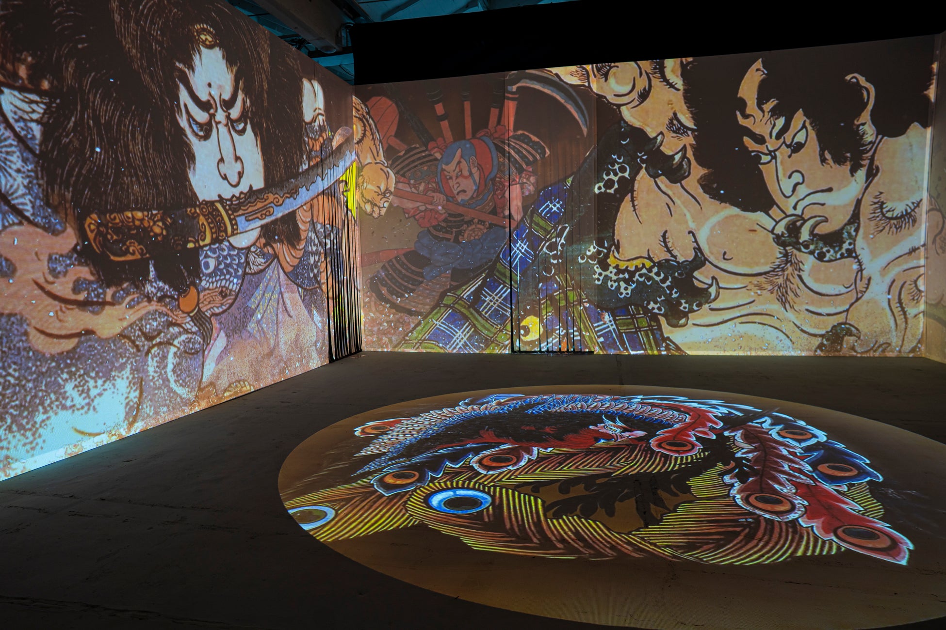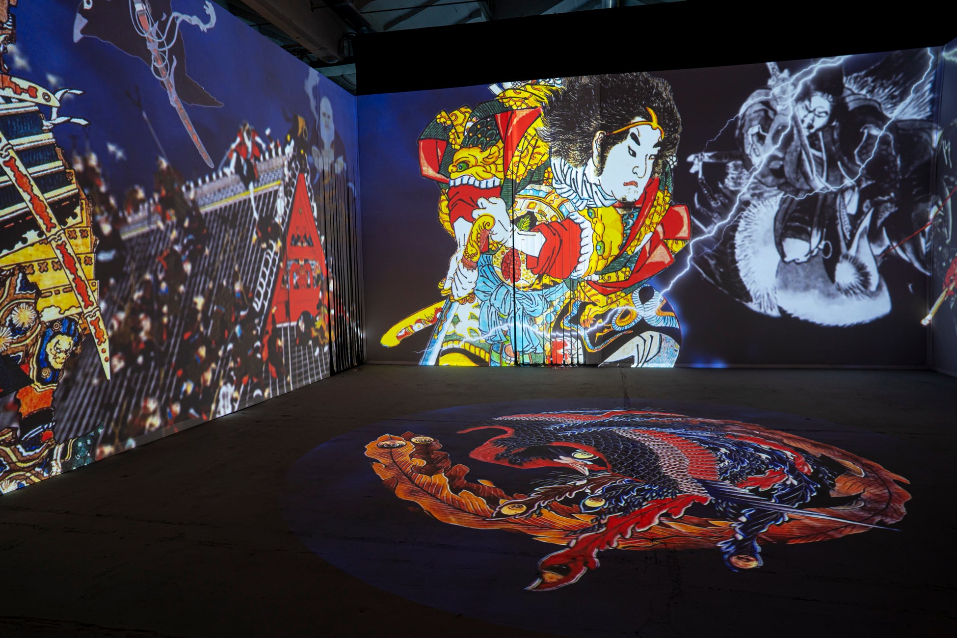 立体映像空間で鮮やかな浮世絵の世界に没入できる体感型デジタルアートミュージアム。歌川国芳の水滸伝シリーズの武者絵や相撲など躍動感、臨場感、エネルギーが凝縮された浮世絵の常識を打ち破る浮世絵の数々。