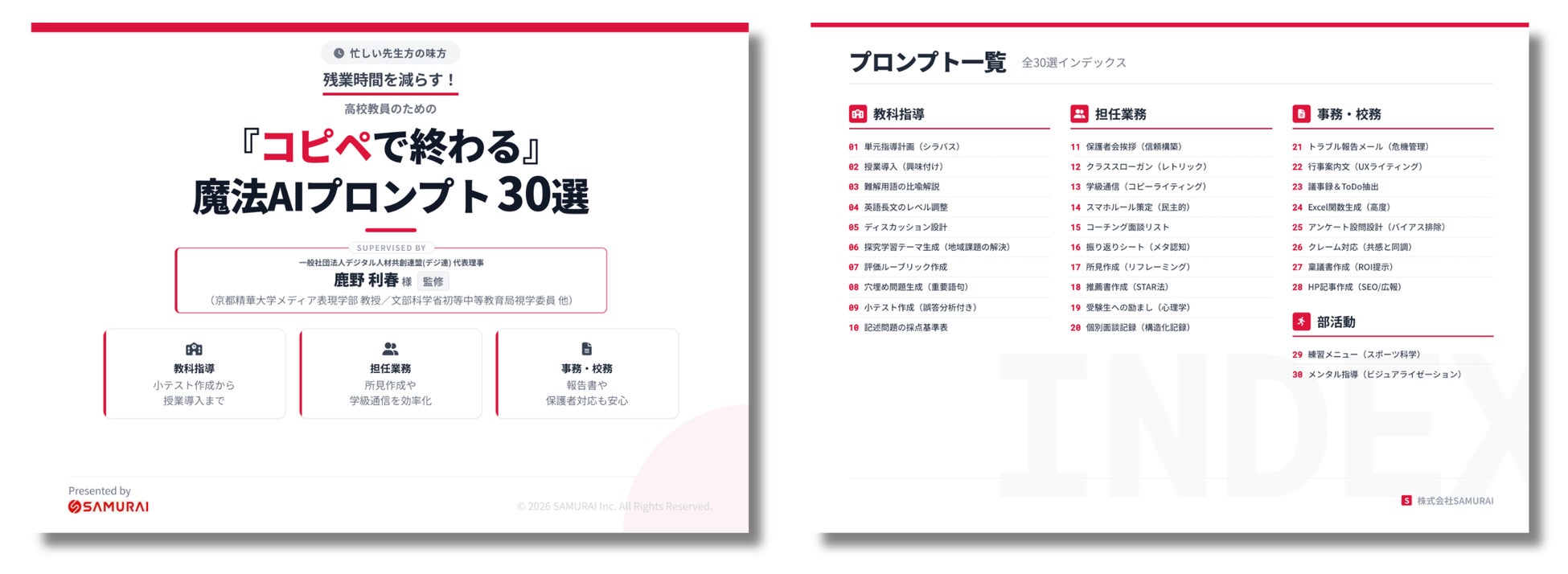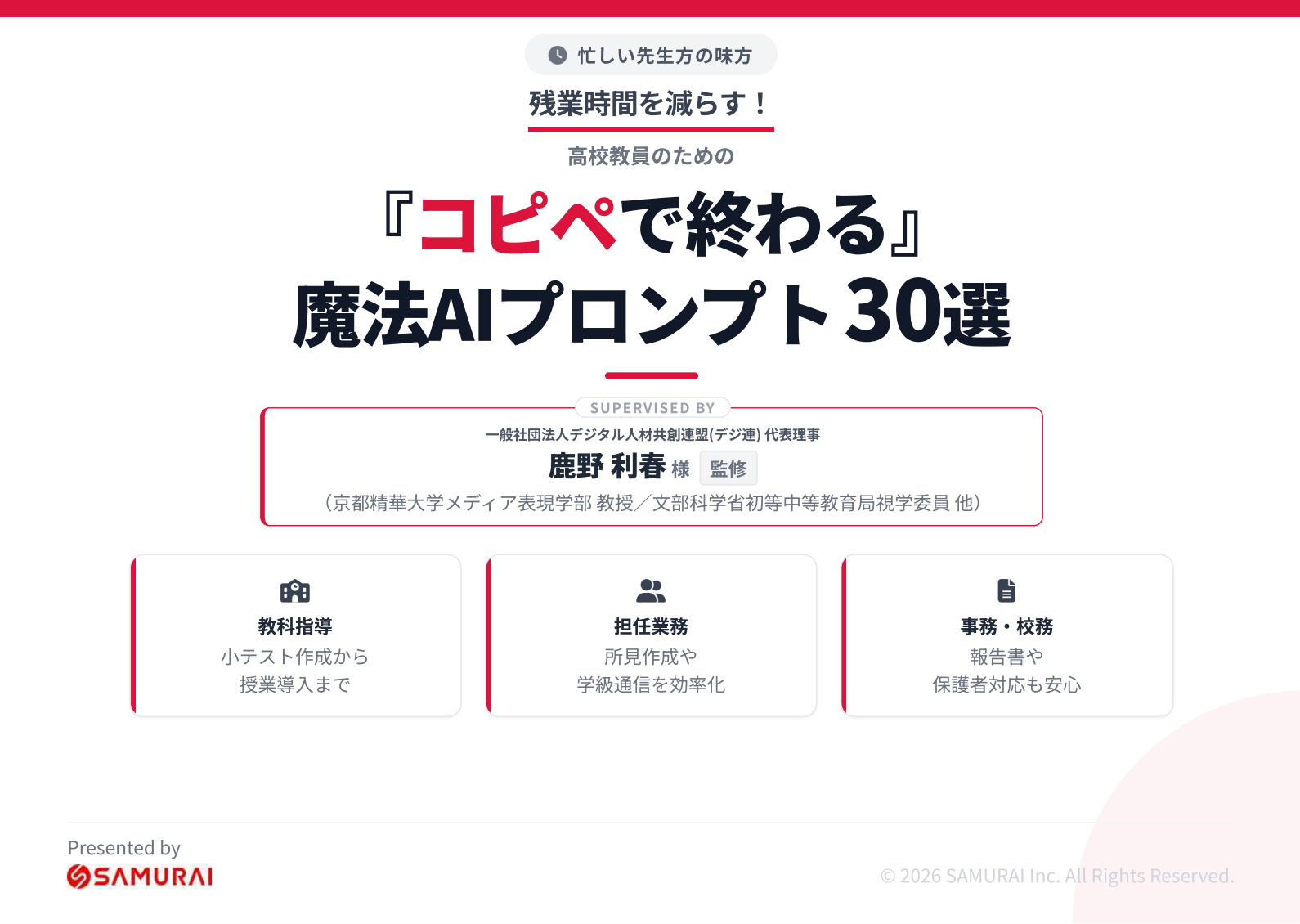DX支援およびIT教育を展開する株式会社SAMURAI(本社:東京都港区、代表取締役:羽田 吾立)は、高校教員の業務をAIで劇的に効率化する、文科省視学委員・鹿野利春氏監修「校務DX魔法のプロンプト30選」を無償で公開いたします。