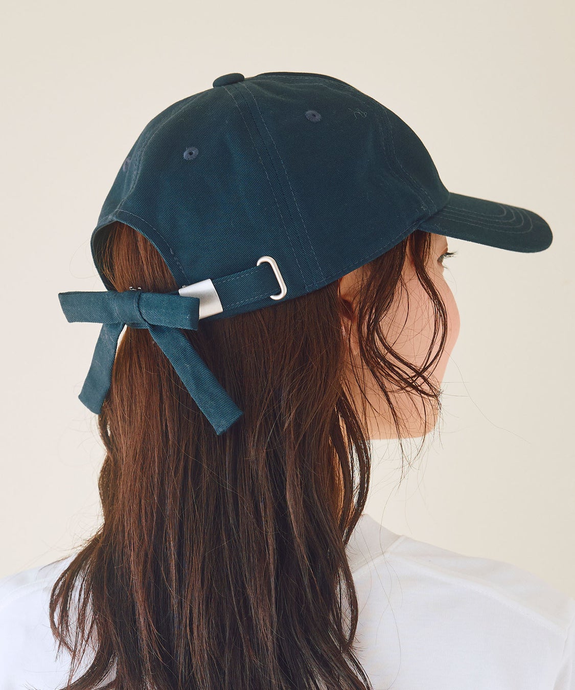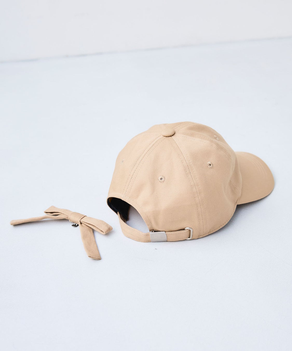 取り外せるリボンがついたキャップ。帽子本体と同じ素材でできたリボン型の飾りが後頭部についていて、クリップ式で自由に取り外せるようになっています。大きめのリボン飾りがとってもキュートで、心がトキめくワンポイントに!