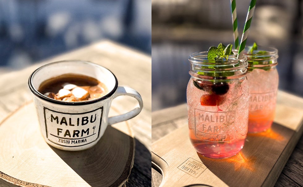 『マリブファーム 逗子マリーナ』では、現地の人気メニューのほか、地元湘南の新鮮野菜や相模湾の魚介類を使用した日本限定メニューもご用意しています。全開可能なサッシによりテラス席と内部が一体となる設えで、約50席の屋内席の他、マリーナの海からつながるような大きな水盤が広がる約80席のテラスには、三方を水に包まれたウォーターテラス席や暖炉を囲むファイヤーテラス席など、シチュエーションに応じてお使いいただけます。豊富なテラス席を有するため、ペット同伴でのお食事に最適なレストランです。