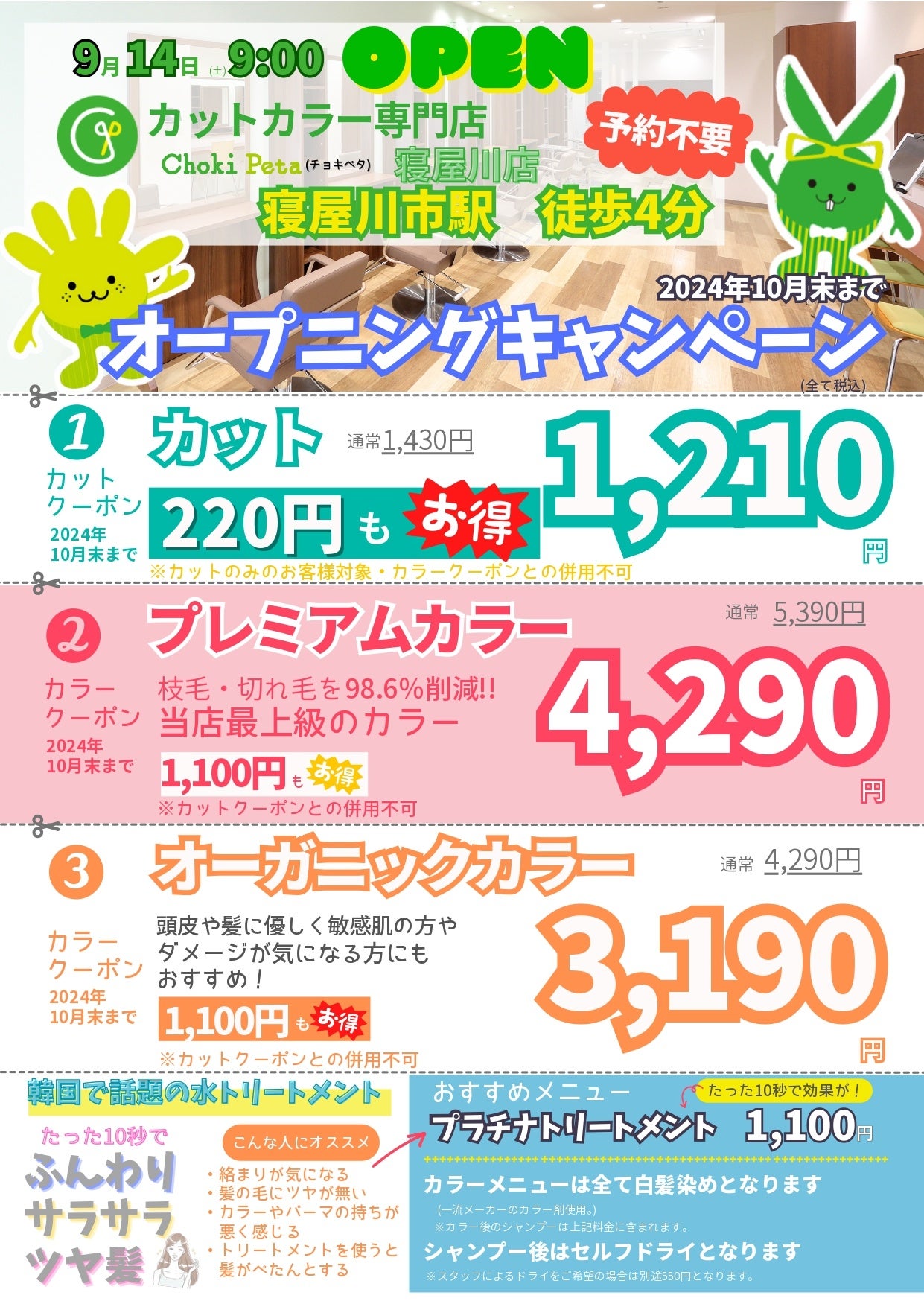 カットカラー専門店 チョキペタ 寝屋川店が9月14日(土)オープン