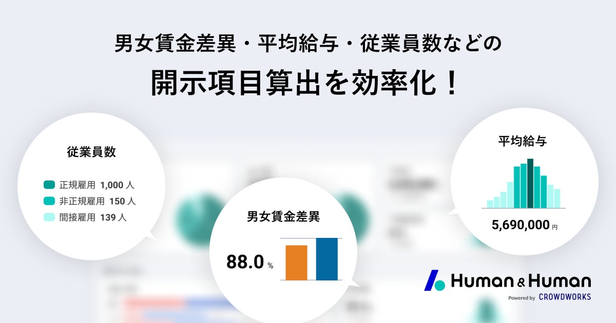 企業と個人をつなぐオンライン人材マッチング事業を展開する株式会社クラウドワークス(本社:東京都渋谷区 代表取締役社長 兼 CEO:吉田 浩一郎 以下「当社」)が運営する人的資本SaaS「Human & Human」は、男女賃金差・平均給与・従業員数など開示項目算出を効率化し、これまで特に集計に手間がかかっていた「非正規雇用者数」の算出をまるごと自動化できる機能を独自に開発・実装いたしましたので、お知らせいたします。